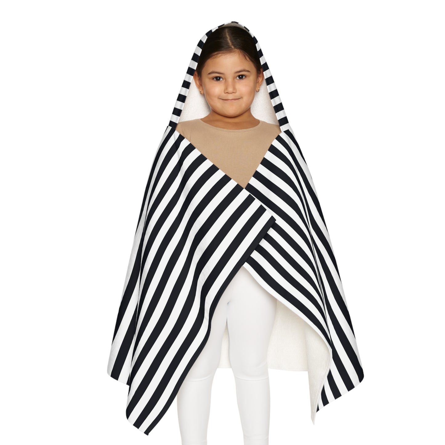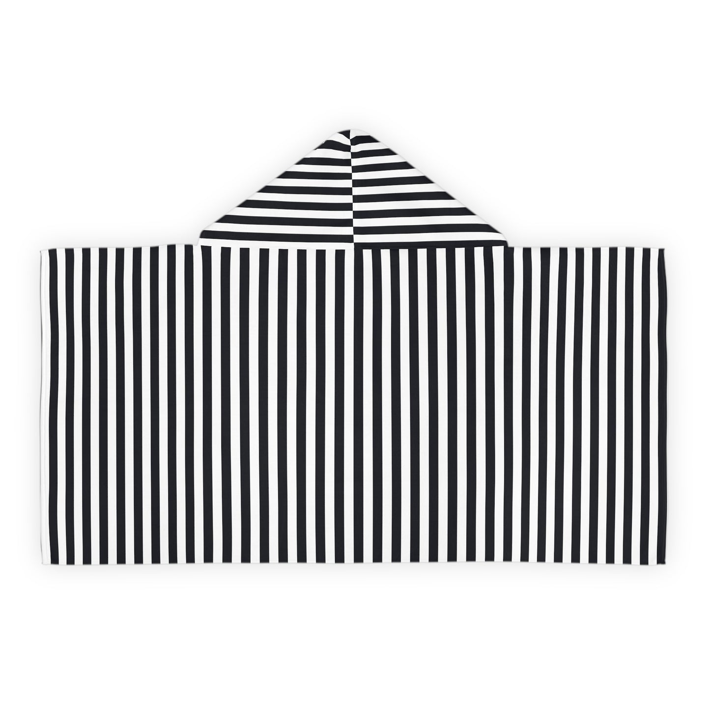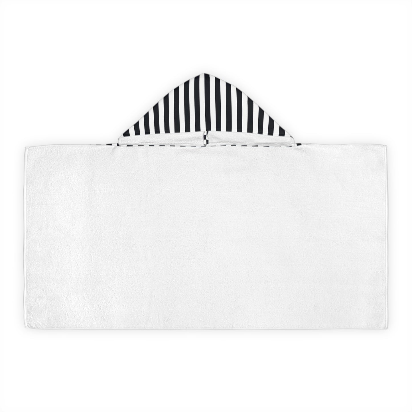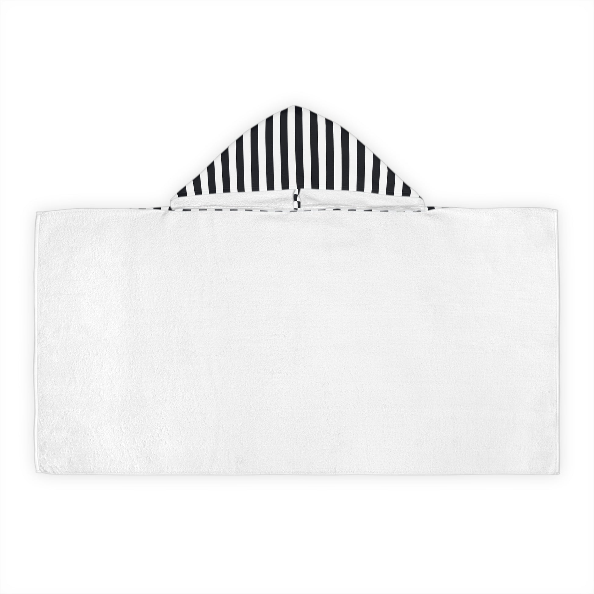 A black and white stripe youth towel with a hood, perfect for goth kids, babies, and fans of Beetlejuice. This towel gives off a spooky, fun vibe and is ideal for the beach, pool, bathtime, or as a costume accessory. Perfect for Halloween, goth-themed events, or just adding a quirky touch to everyday life.