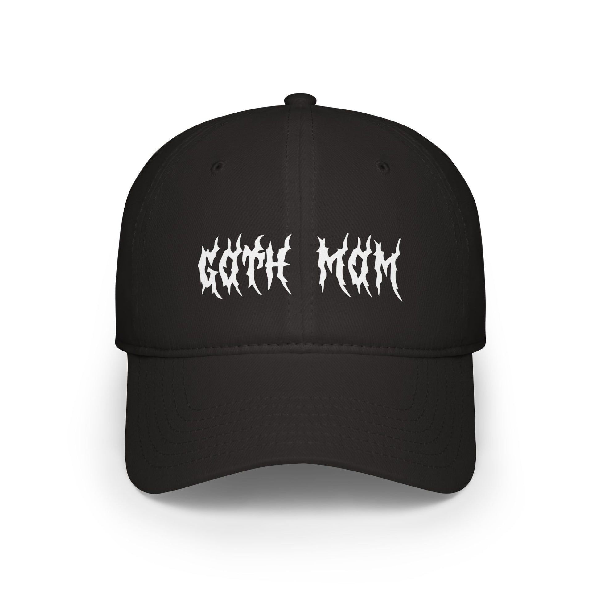 A goth mom baseball cap in doom metal font, perfect for those who love a dark and edgy style. This cap is a must-have accessory for alternative fashion lovers and goes well with outfits for music festivals, concerts, and casual outings.