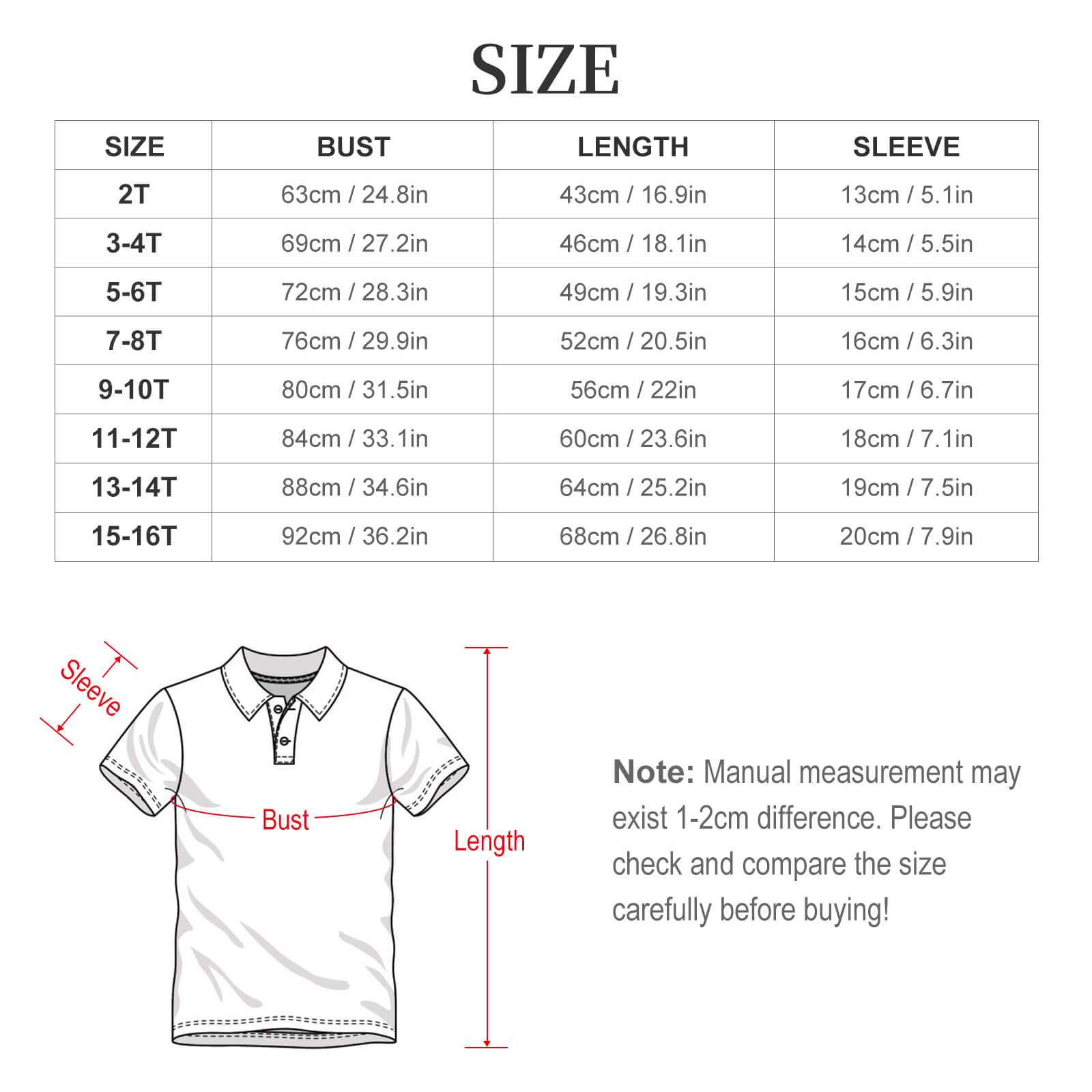 | 15-16T | 92cm /36.2in | 68cm/26.8in | 20cm/7.9in |