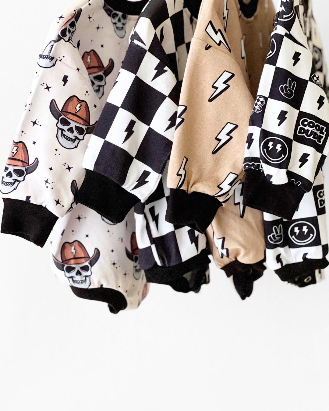 Hey cool dudes! This long sleeve bubble romper is made of super soft and comfy cotton fabric.