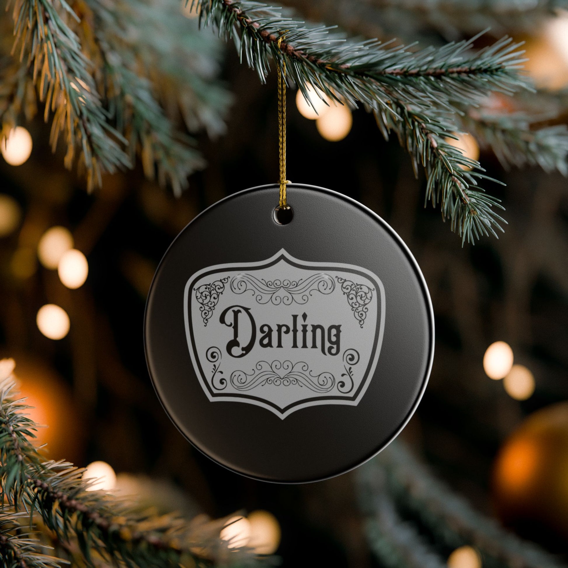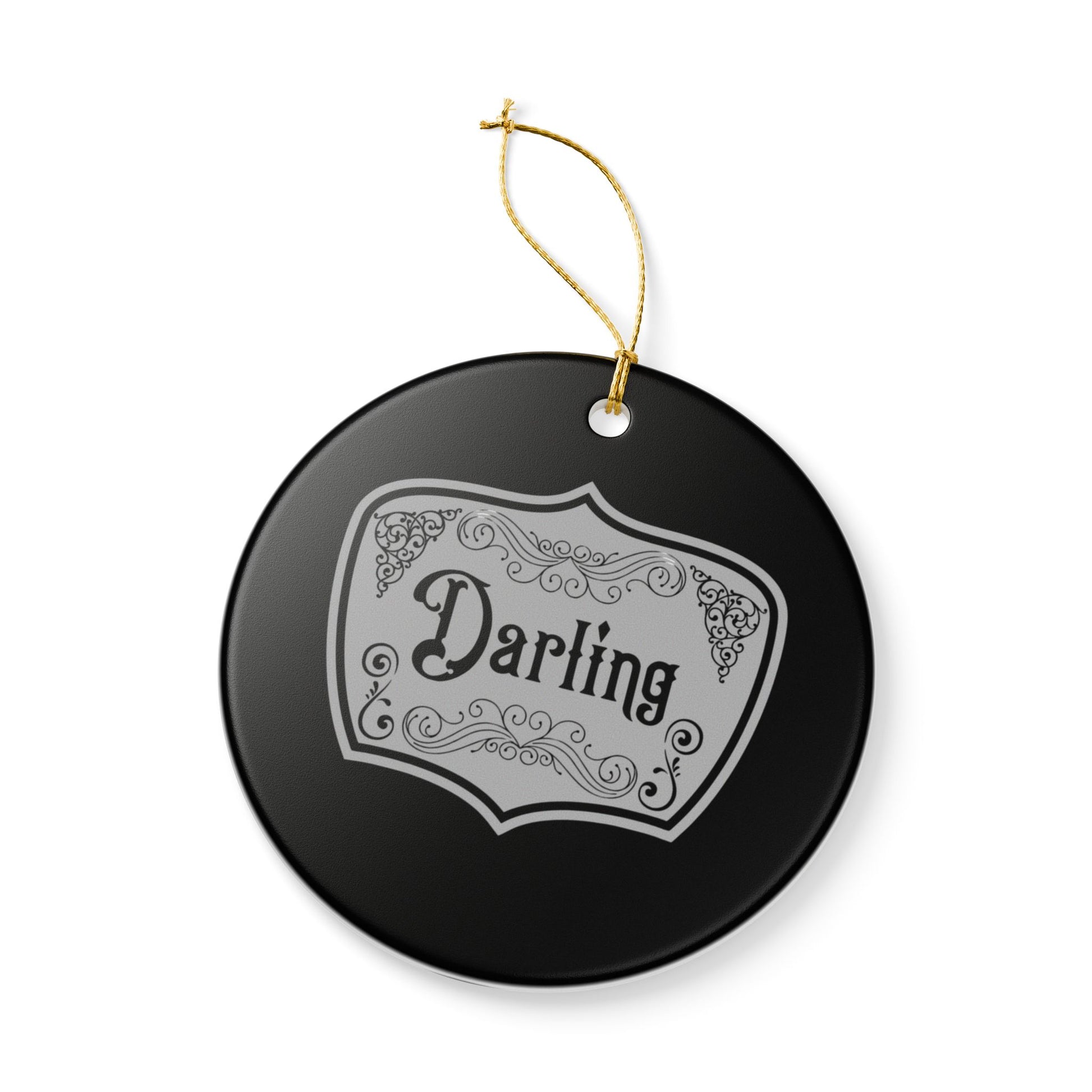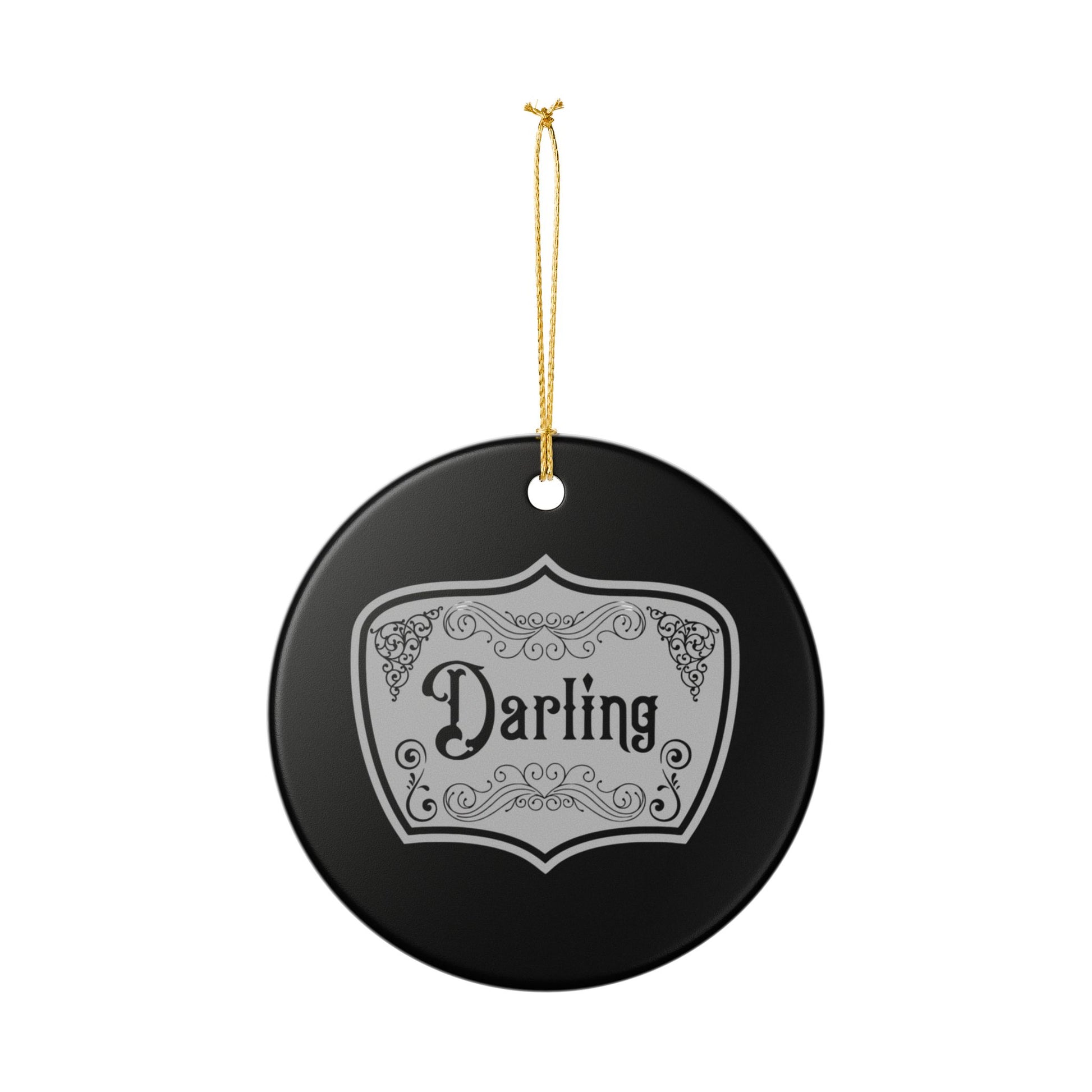 A darling ornament for your Victorian-lovin' darlings! Our classic "darling" logo, inspired by funeral casket plaques of the Victorian era, makes a perfect spooky-yet-elegant look. The round shape offers a classic, versatile look that complements both traditional and modern home decor styles. Whether you make them into a holiday tree decoration, a thoughtful gift, or a stylish accent in your home, it brings warmth to any setting. Their durable yet delicate nature makes them a cherishable item.