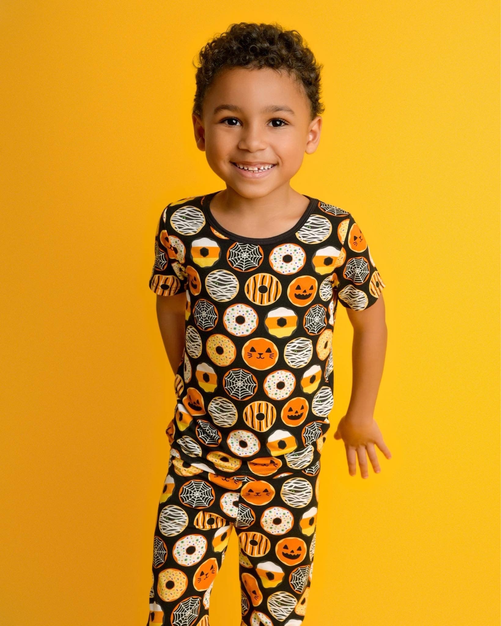 Popoki Halloween is here! Two piece short sleeve shirt with pants pajama set. Our exclusive hand drawn print features a black background with spooky fun Halloween themed donuts of Jack-o-lantern, black cat, mummy, spiderwebs, sprinkles and stripes.