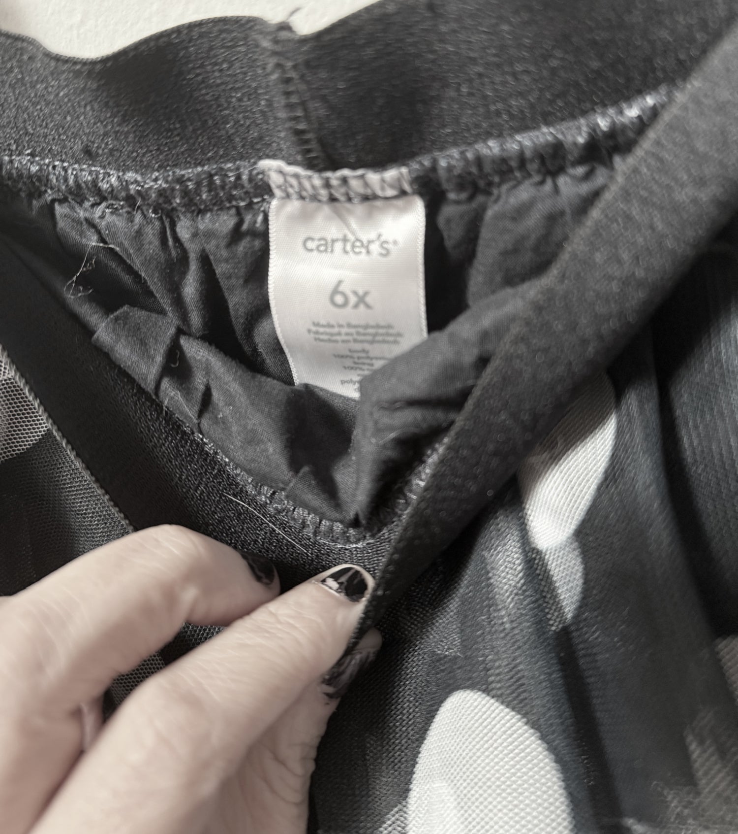 This skirt is SUCH a cute piece! It is by the classic brand Carter's and is a size 6X. The waist is elastic and it was gently used. The outer features a soft, black and white polka dot mesh in a series of ruffles. It is lined in a black cotton. It shows signs of wear in the lining and waistband, but very little on the outer ruffles. Very good shape and LOTS of life left!