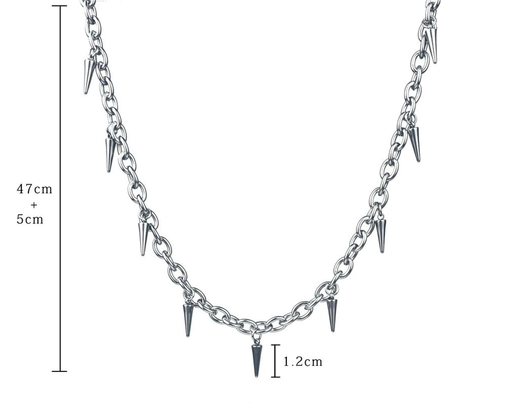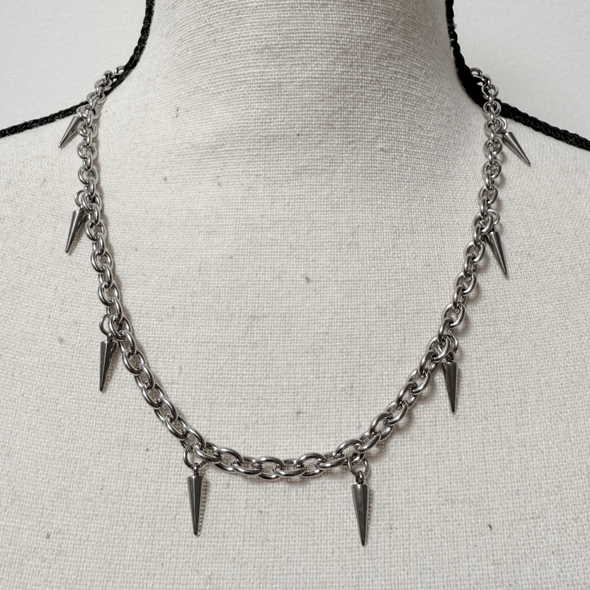 This necklace is the perfect everyday goth/punky accessory. Silver-toned stainless steel metal, lobster claw closure, and a thick chain base, laden with spikes. 18" long with a 2" extender and the spikes are .5" long.