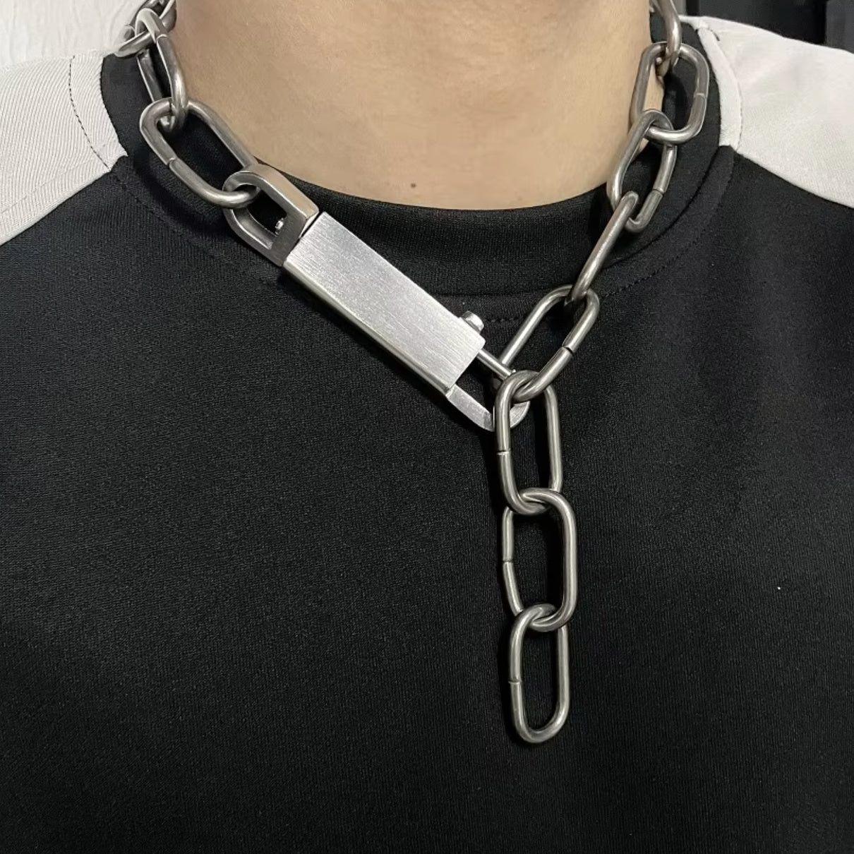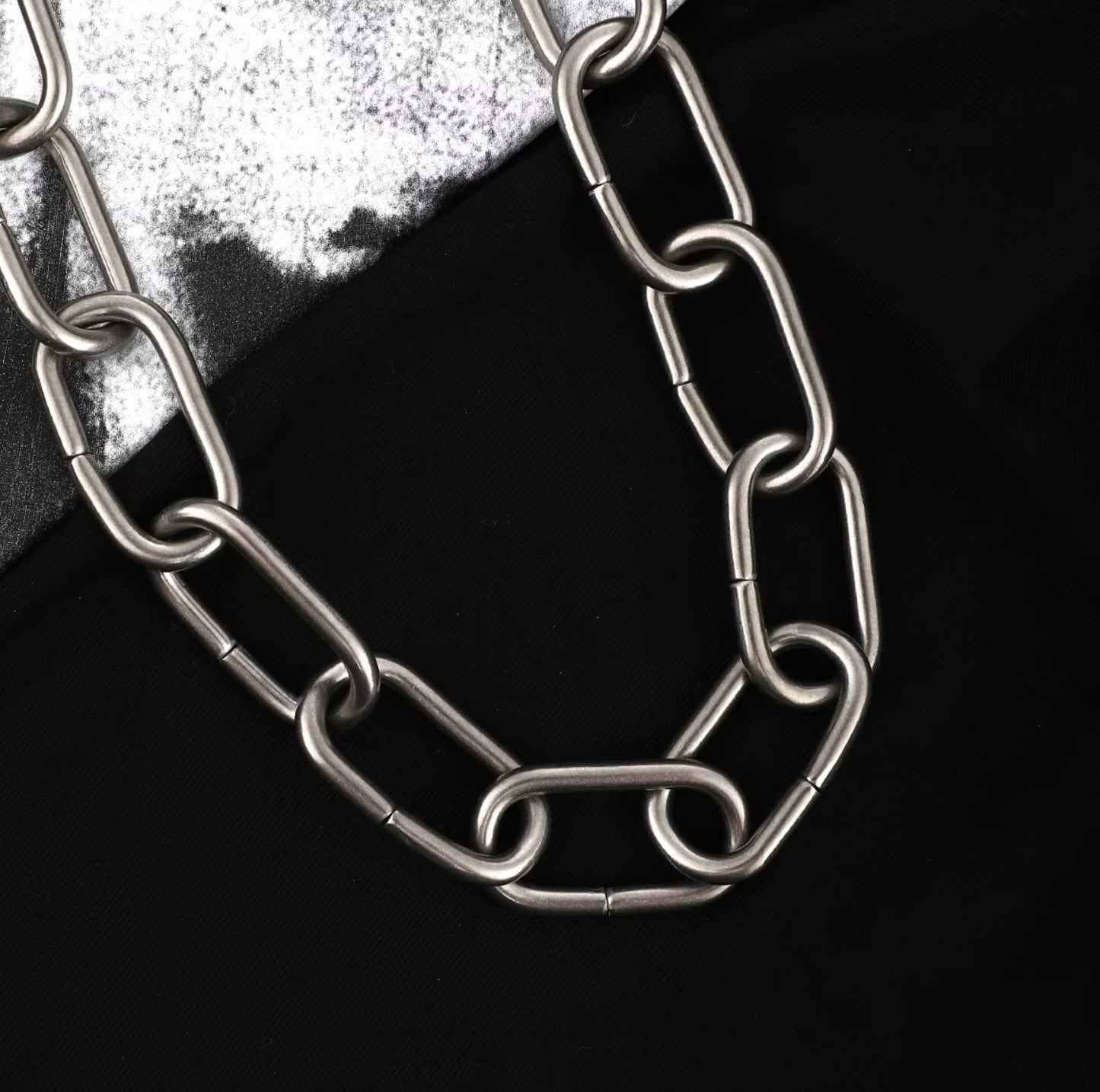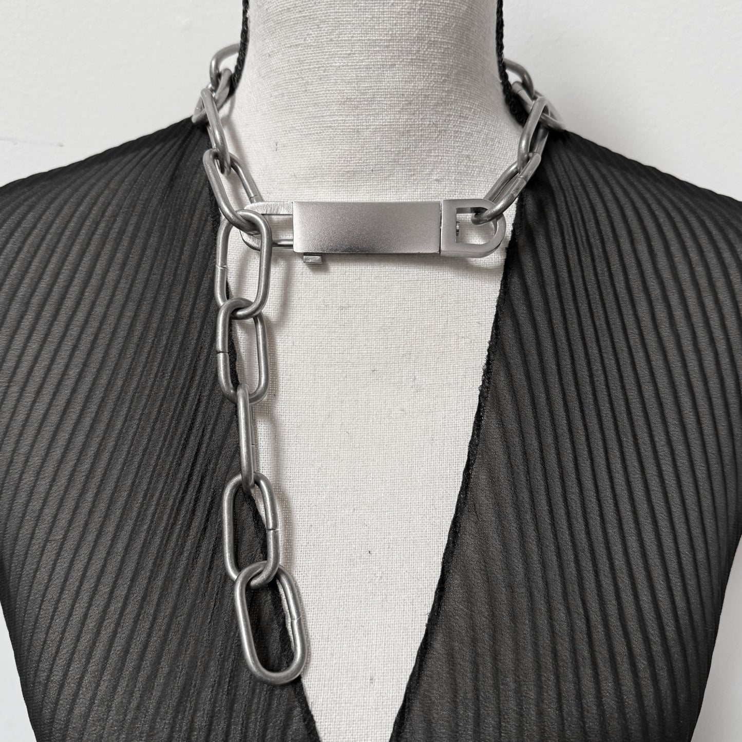 This necklace is just so cool. A mix of high fashion sensibility with the tough freedom of punk and industrial, the Anarcho Chain Necklace is sure to enhance your daily looks. Made of stainless steel but with a matte finish. Can be worn as one loop OR clip the closure closer to the neck for a y-shaped choker look. The chain measure 20".