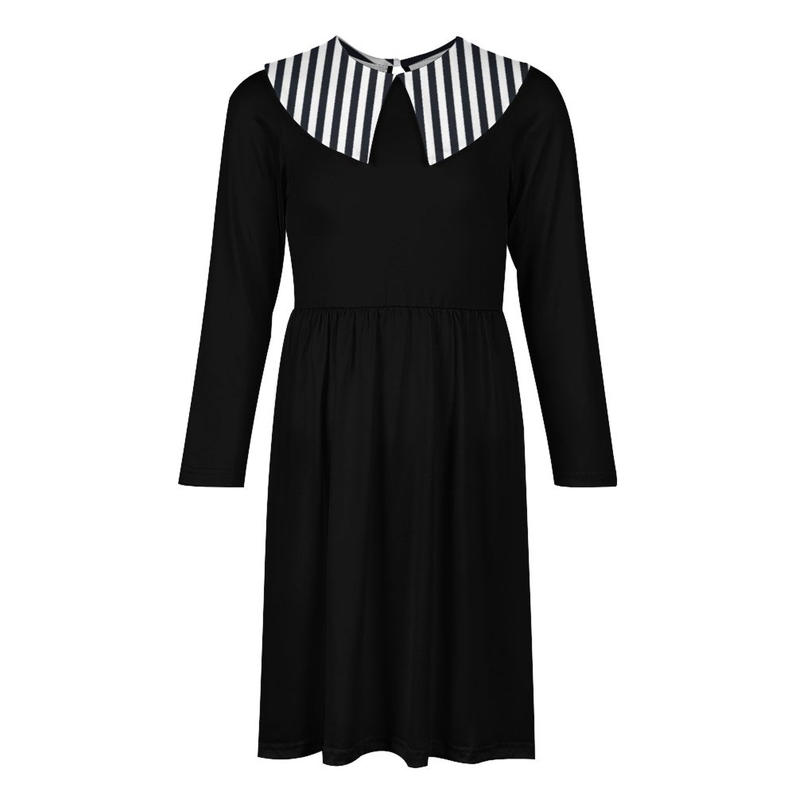 The Beetleboo Collared Dress is a fun twist on the classic Wednesday Addams style. Instead of a white collar, this Is a sassy black/white stripe collar...very ooky spooky and cutesy! These dresses are made to order, so please allow up to a month for delivery. If you order additional items, they will be shipped separately.