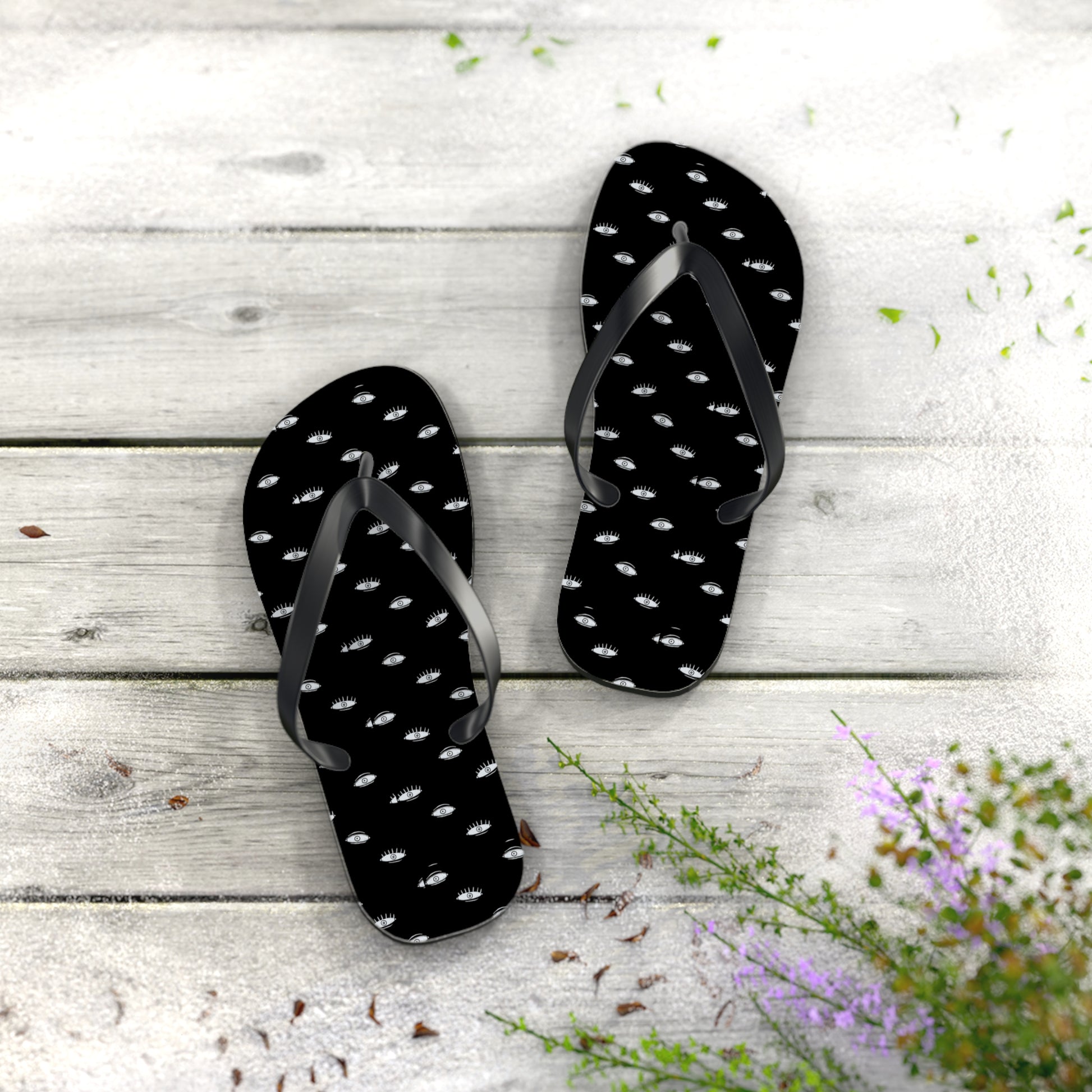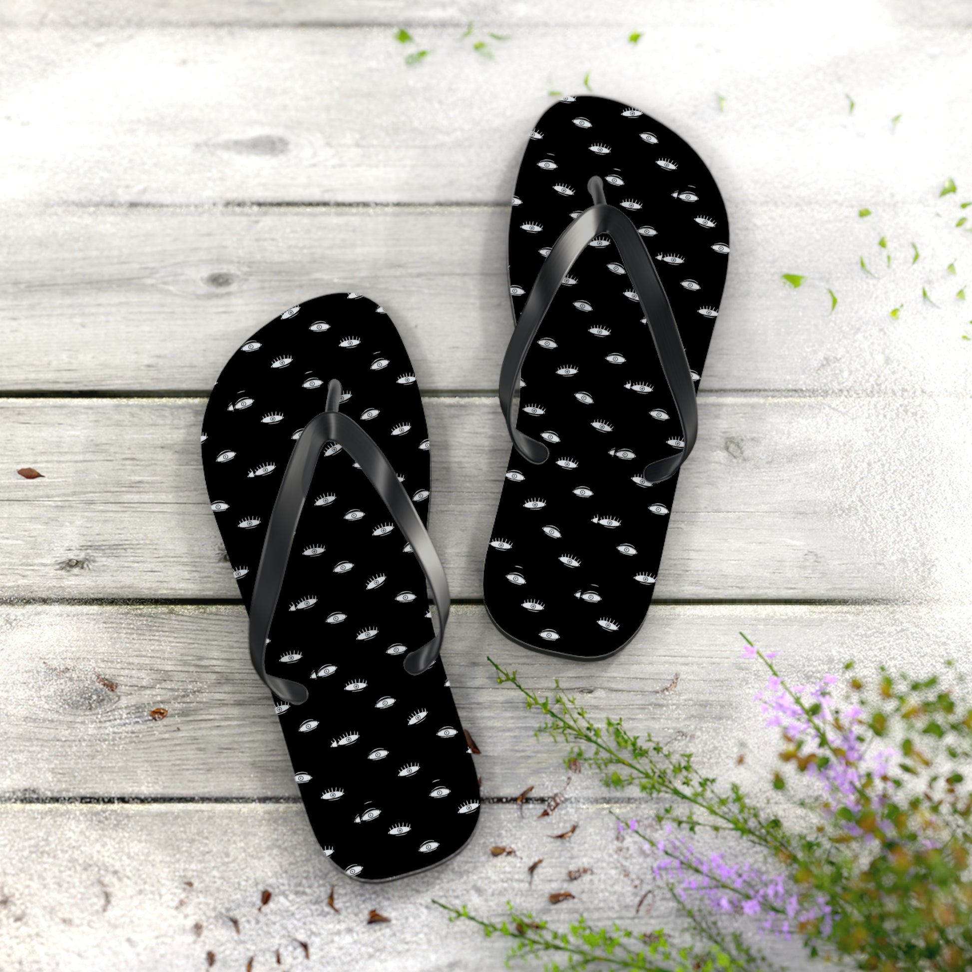All-day comfort is the name of the game when summer is on. These eye print black flip flops are the perfect compliment to your summer or beach escapades. With an easy slip-on design, a cushioned footbed, and top-tier printing fidelity, these flip flops are a guaranteed summer hit.
