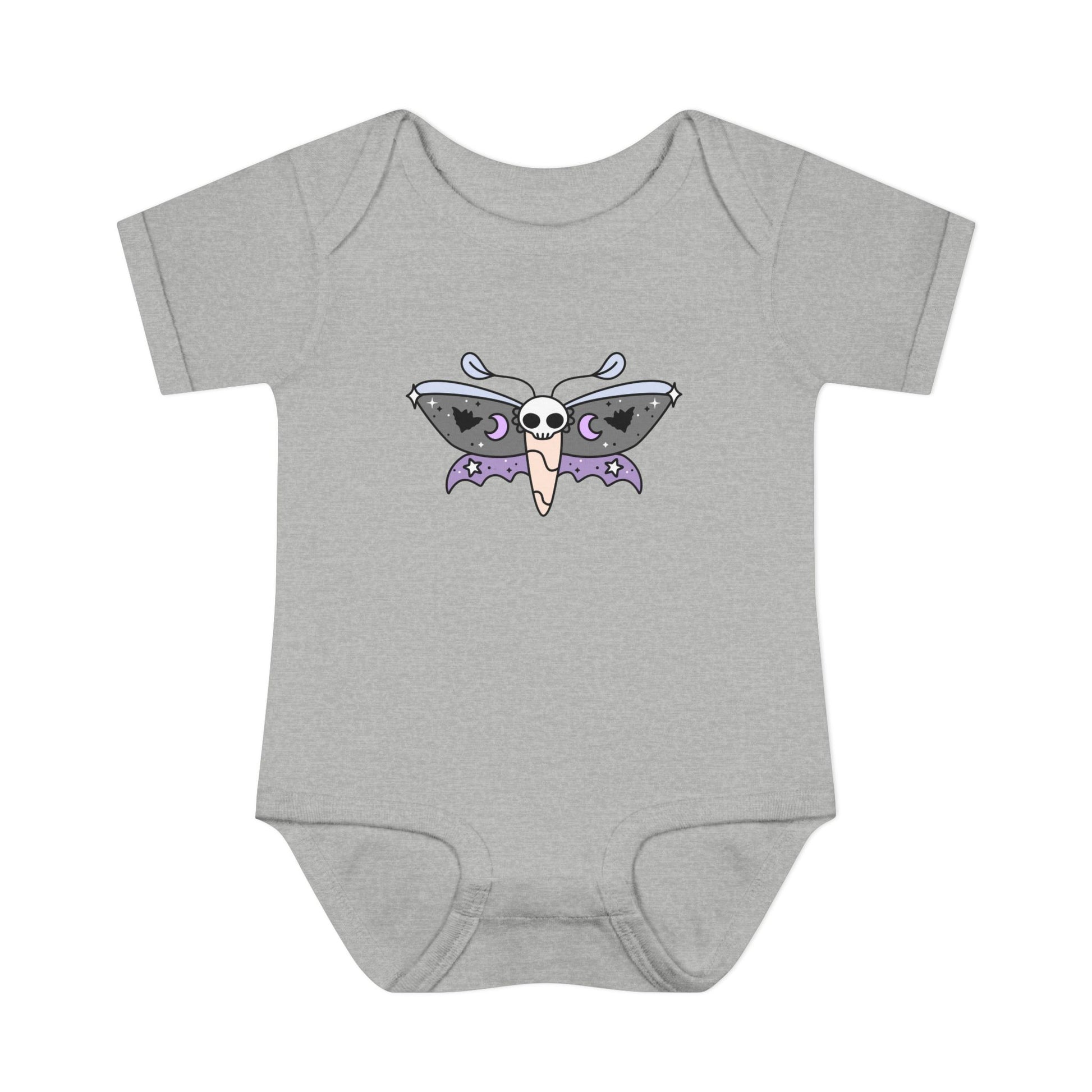 Moths are some of the coolest creatures...and this cute cartoon is SUCH a cute take on a moth. The ring-spun cotton fabric of this infant baby rib bodysuit makes it supremely soft...a must for darling babies. Any chafing, itching or other discomfort just makes for one grumpy little one. These bodysuits have lap shoulders and snaps for easy diaper changes. These are made of 100% ring-spun cotton for solid colors.