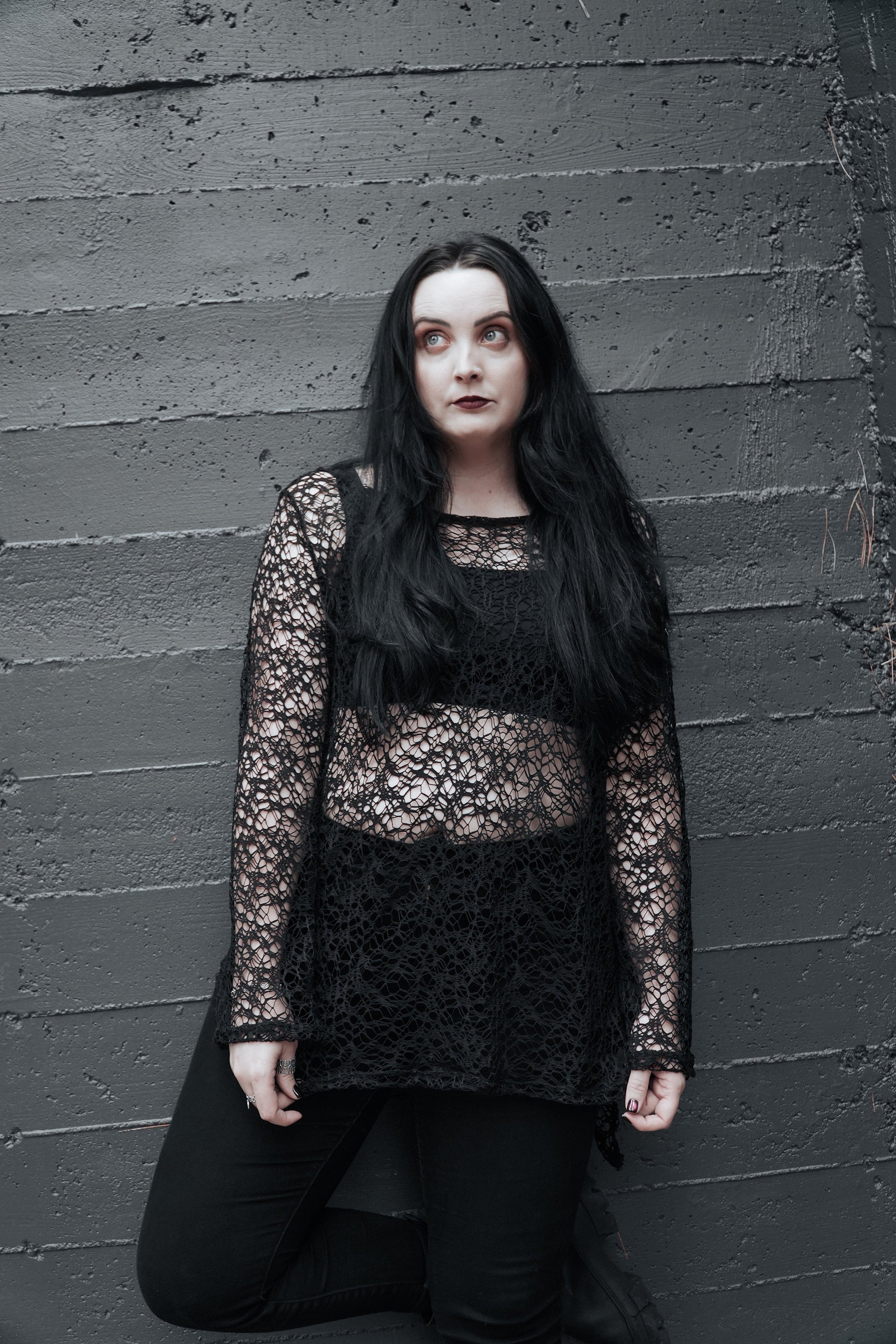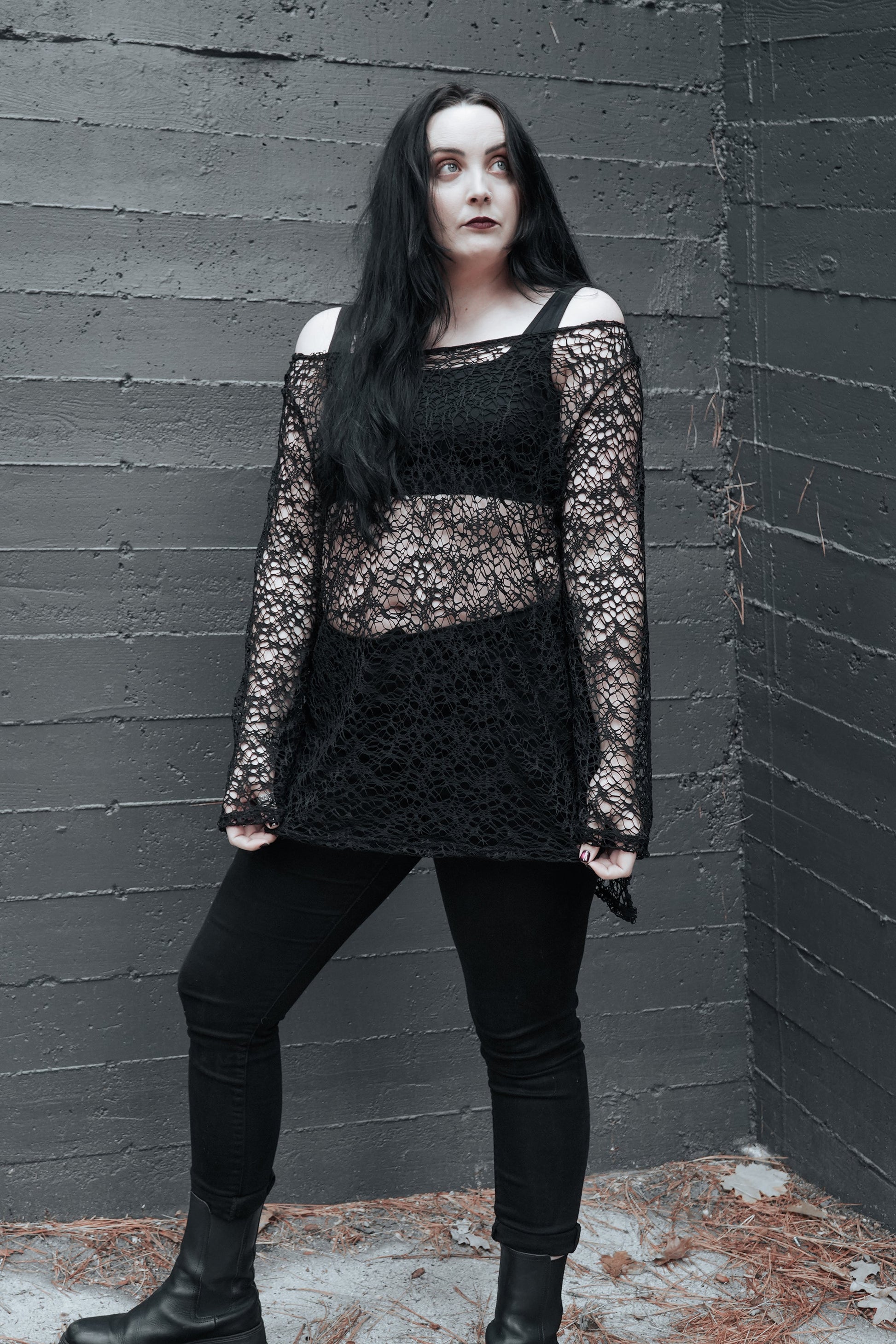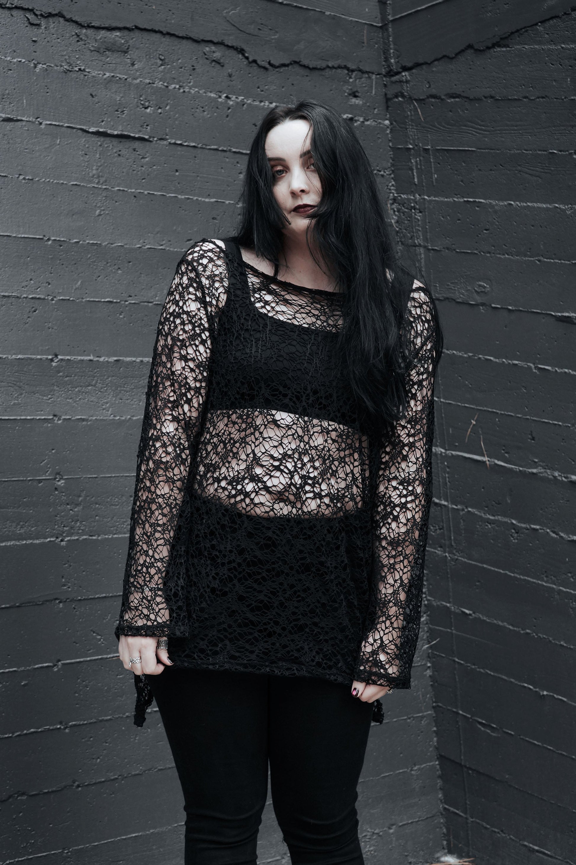 The Solstice Spell Sweater brings witchy texture to your winter wardrobe with its eerie, creepy cloth inspired knit. Lightweight with a loose, open-weave finish, it creates a subtle fishnet effect that layers effortlessly over tanks, dresses, or long sleeves. Soft, breathable, and intentionally distressed in feel, this piece adds instant ritual-ready drama to any look.