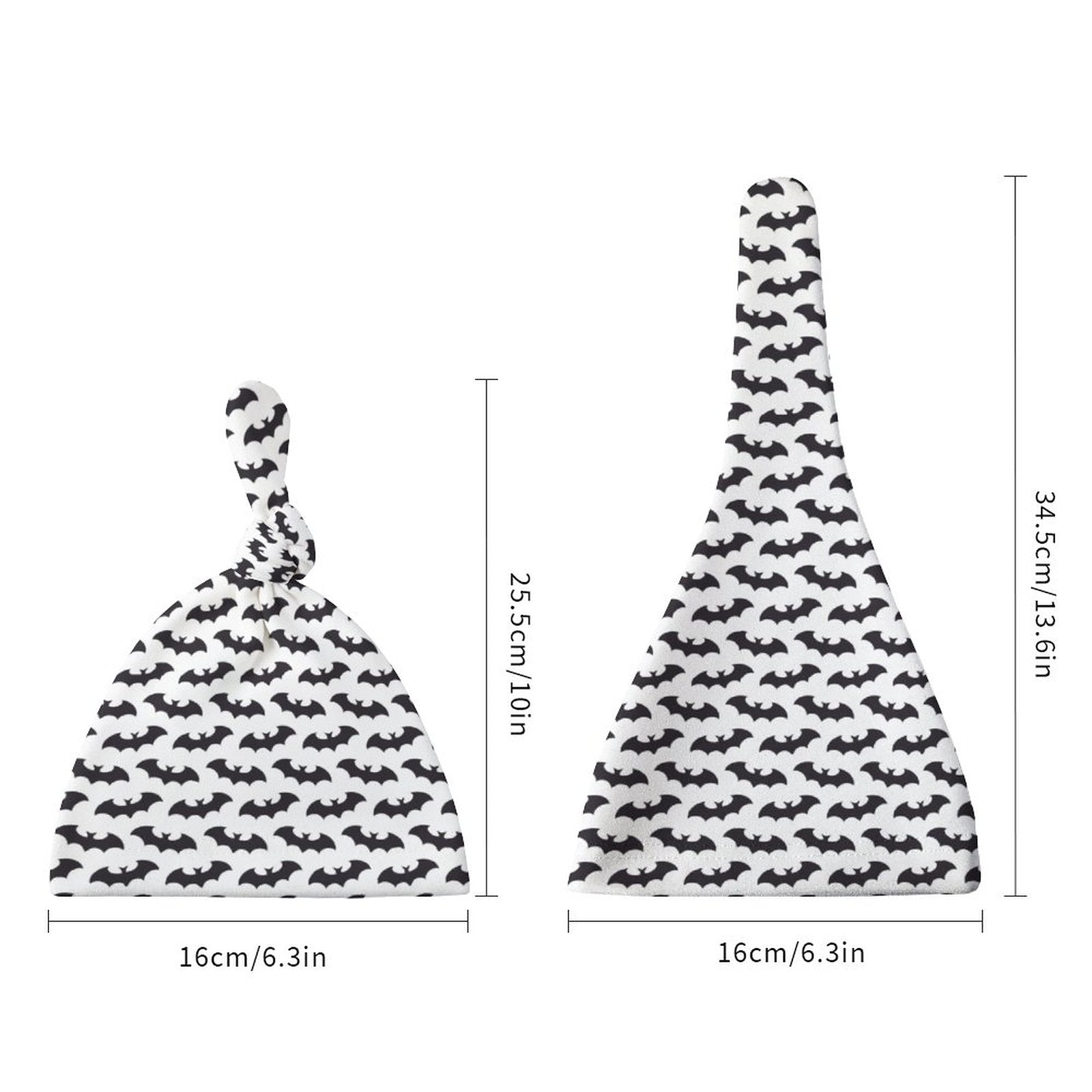 This set of 2 baby hats features an all over white/black bat print. These baby hats are made to order, so please allow up to a month for delivery. If you order additional items, they will be shipped separately.