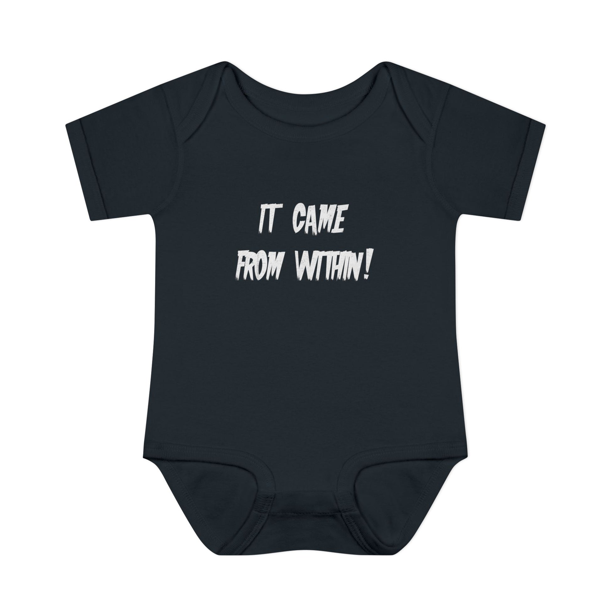 Inspired by 1950s B Horror Movie posters, this tongue n cheek "It Came from Within!" onesie is a fun play on monsters and pregnancy. The ring-spun cotton fabric of this baby rib bodysuit makes it supremely soft, a must for delicate baby skin. A one-piece design, these bodysuits have lap shoulders and snaps for diaper changes. These are made of 100% ring-spun cotton for solid colors.