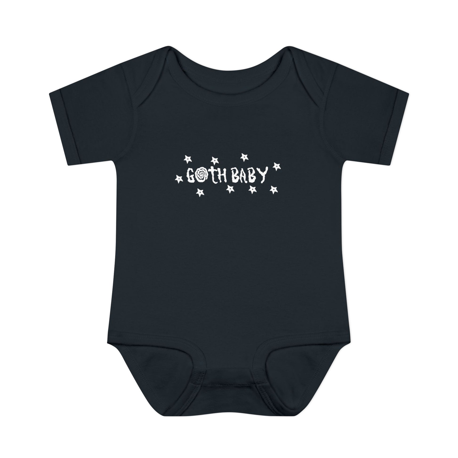 This new whimsical Goth Baby design is perfect for those of us who are from (or fans of) the late 1900s! Featuring white print on a black onesie that reads Goth Baby with stars, this may seem simple, but packs a stylish punch. The ring-spun cotton base of the infant baby rib bodysuit makes it supremely soft, a must for baby's sensitive skin. Any chafing, itching or other discomfort equals a deal-breaker. A one-piece design, these bodysuits have lap shoulders. T