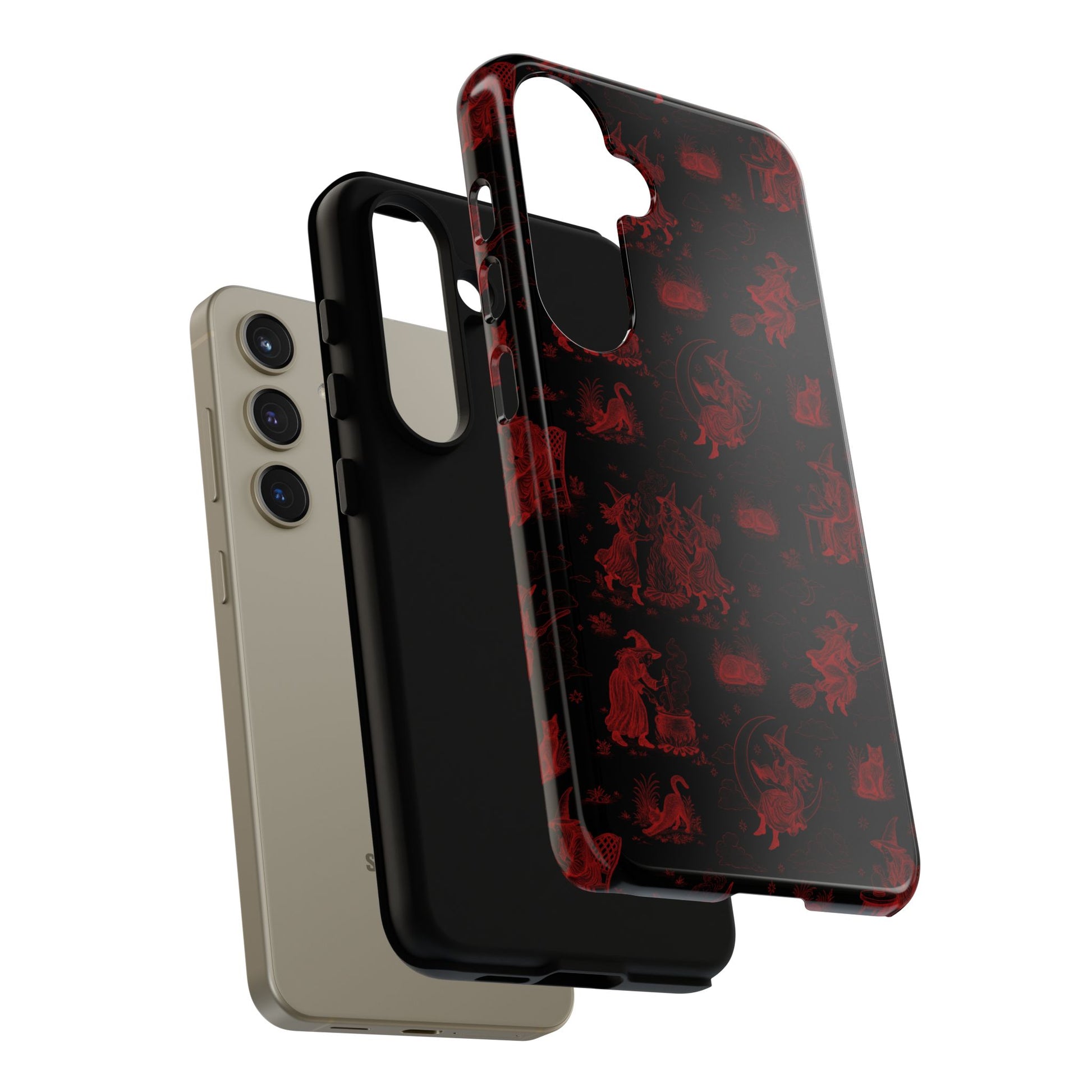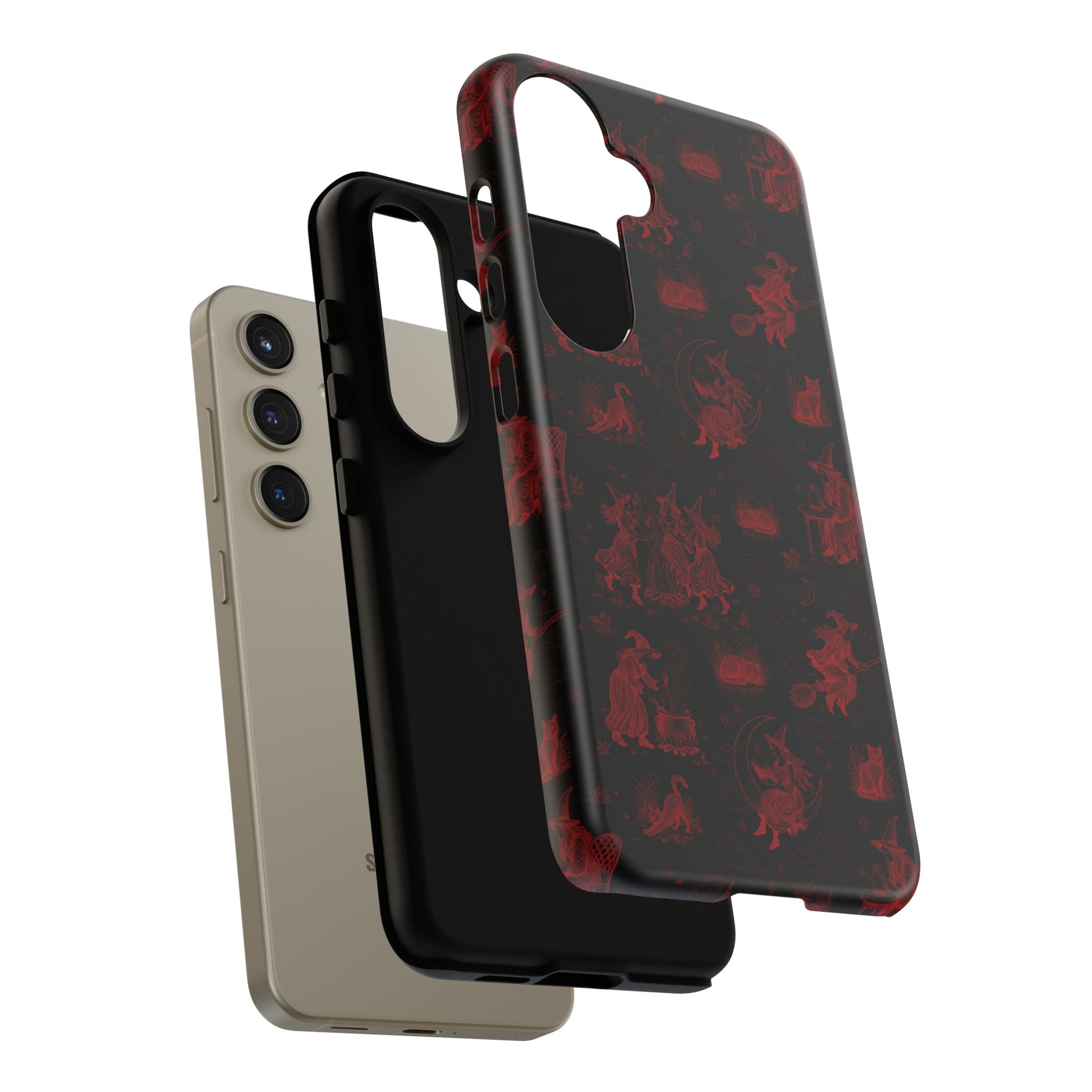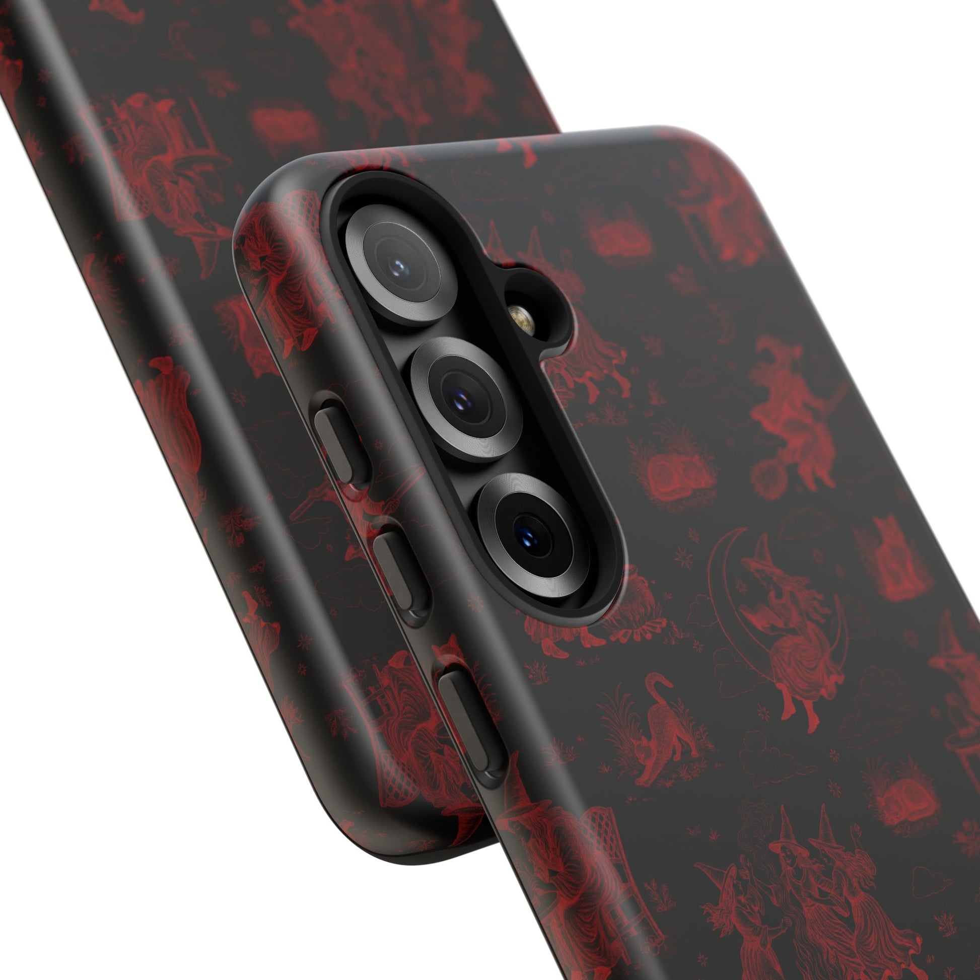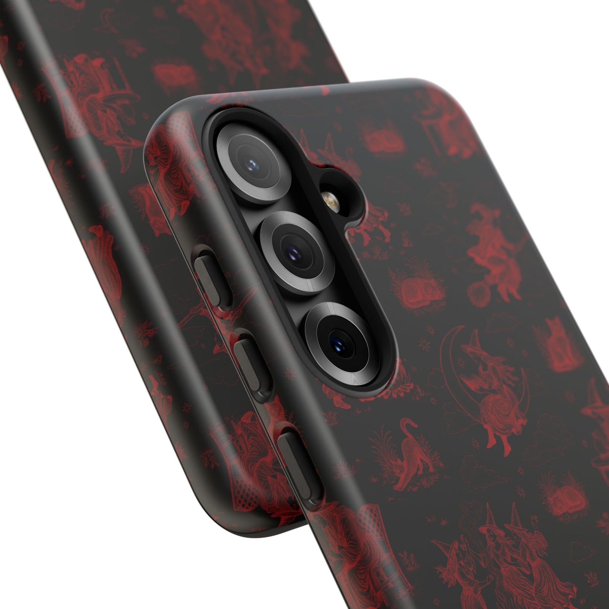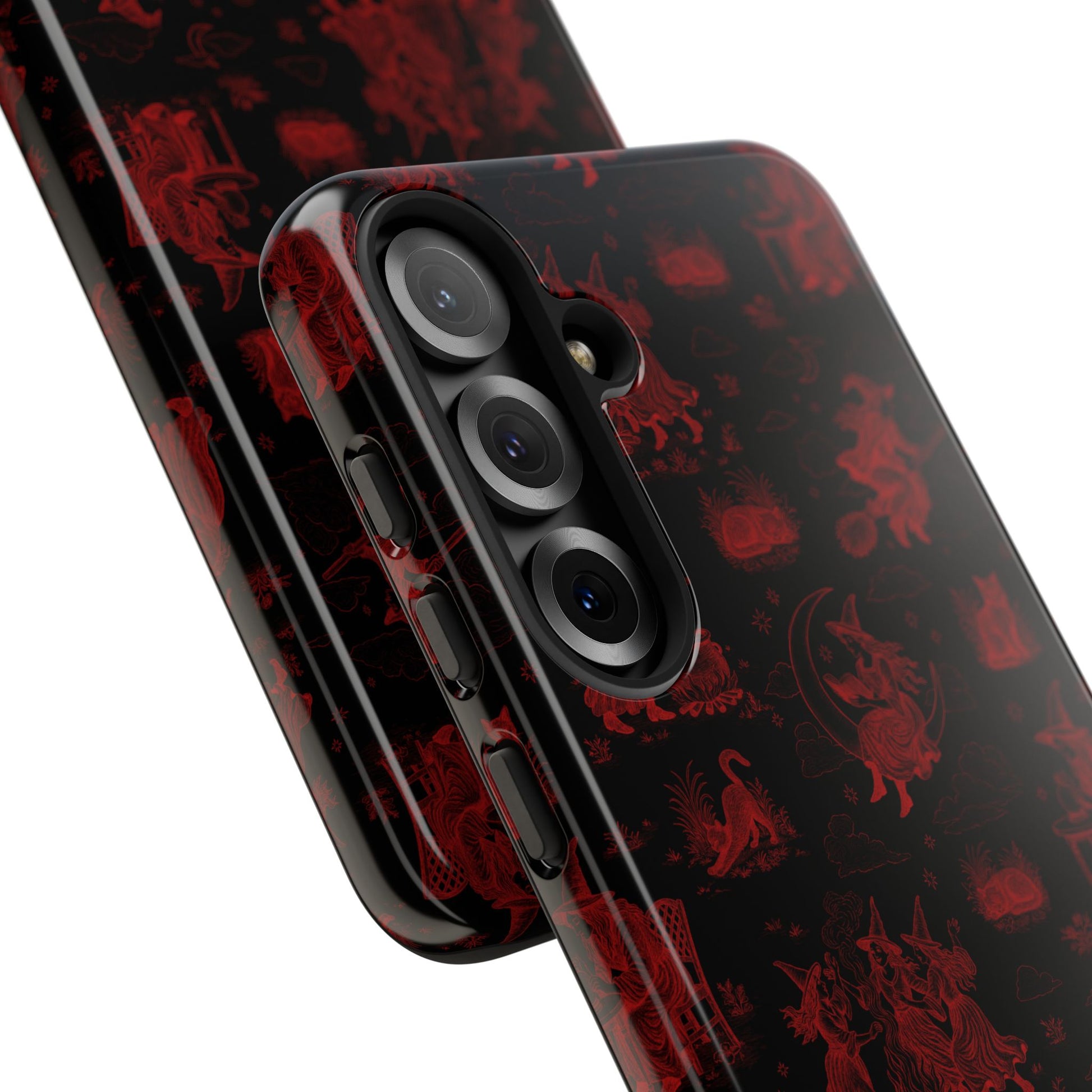 Spooky swag out your iPhone, Samsung Galaxy, and Google Pixel devices with premium-quality protective phone cases. These are printed with the Witchy Toile pattern in black/red. Every case has double layers for extra durability and protection while the clear, open ports stay out of your way when it comes to charging. The outer polycarbonate shell will resist daily impacts. Choose between matte or glossy finish and enjoy adding a unique touch to your phone with our custom protective phone cases sourced from Korea.