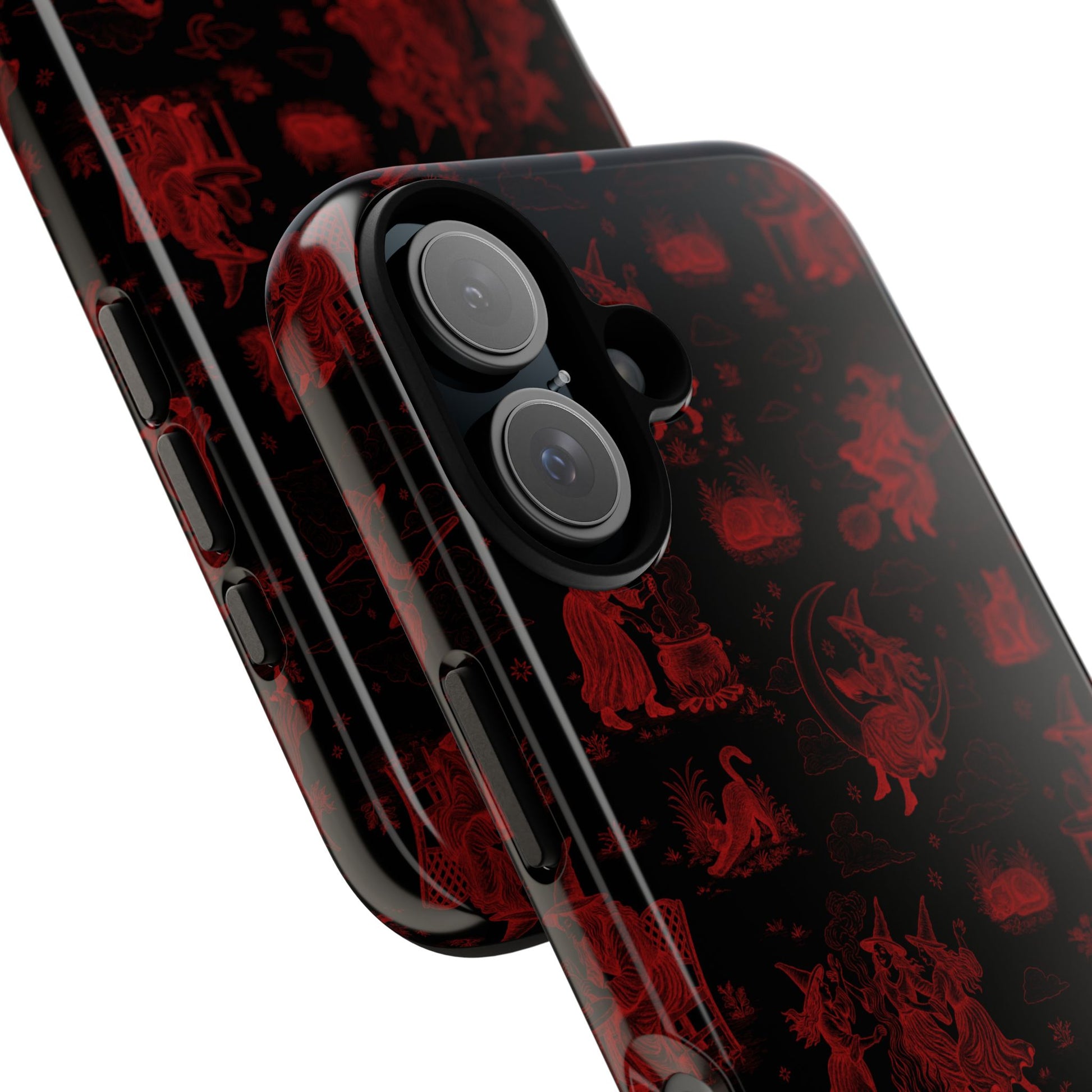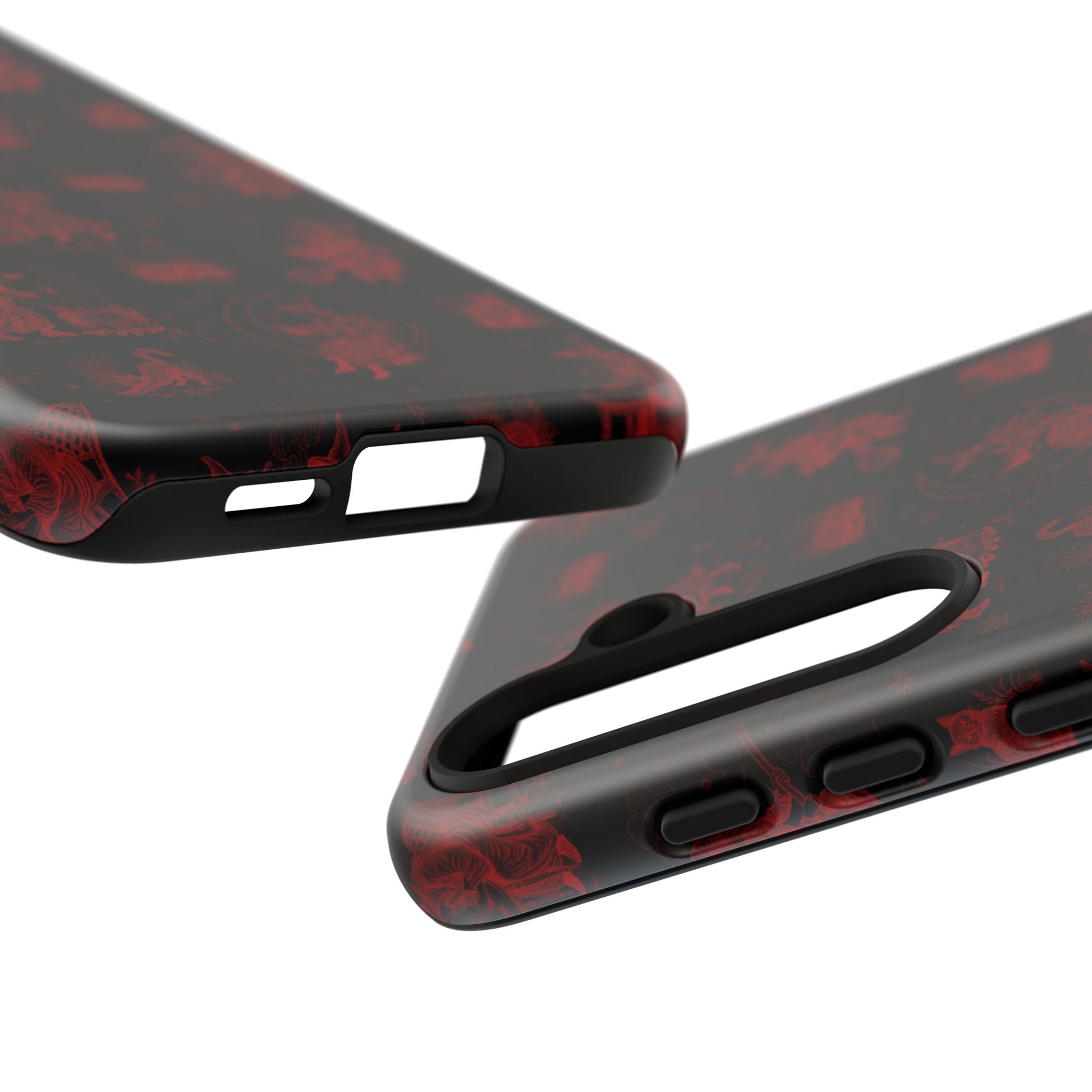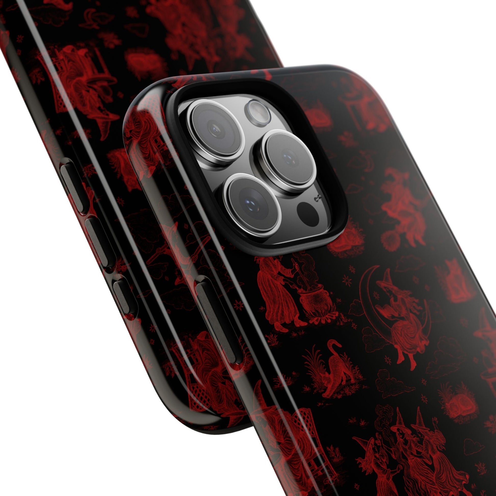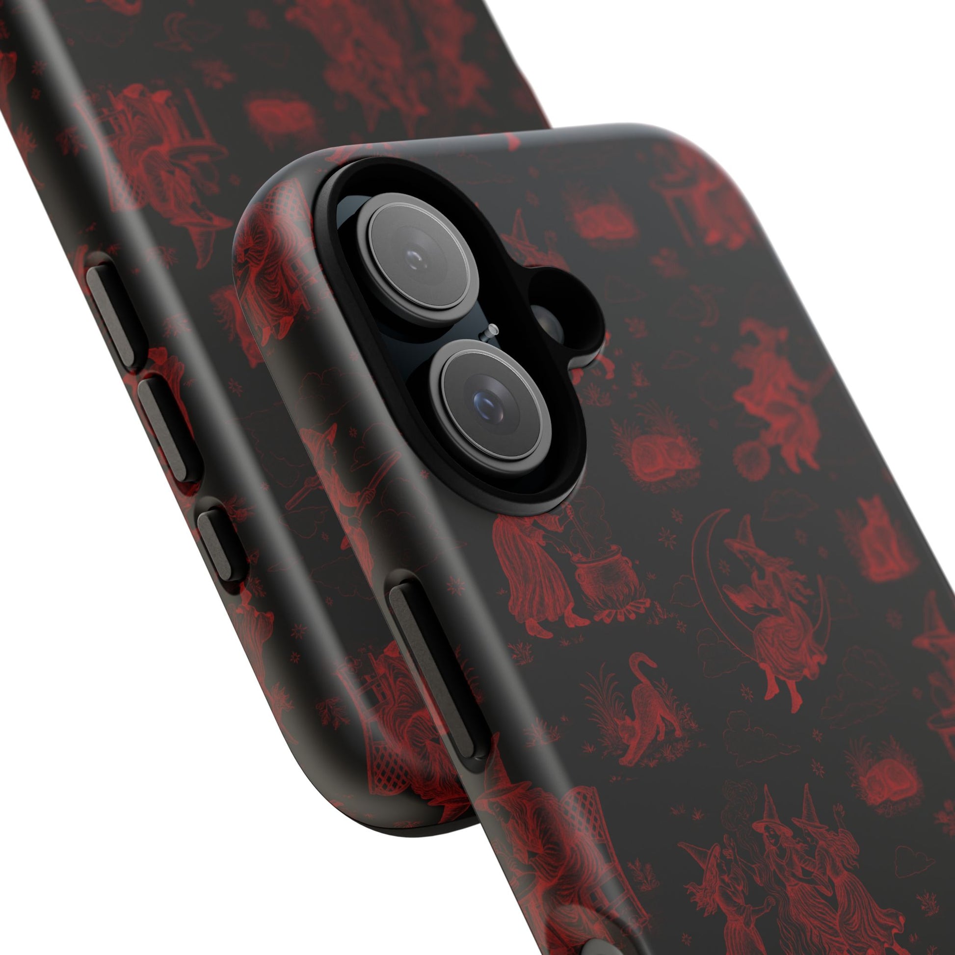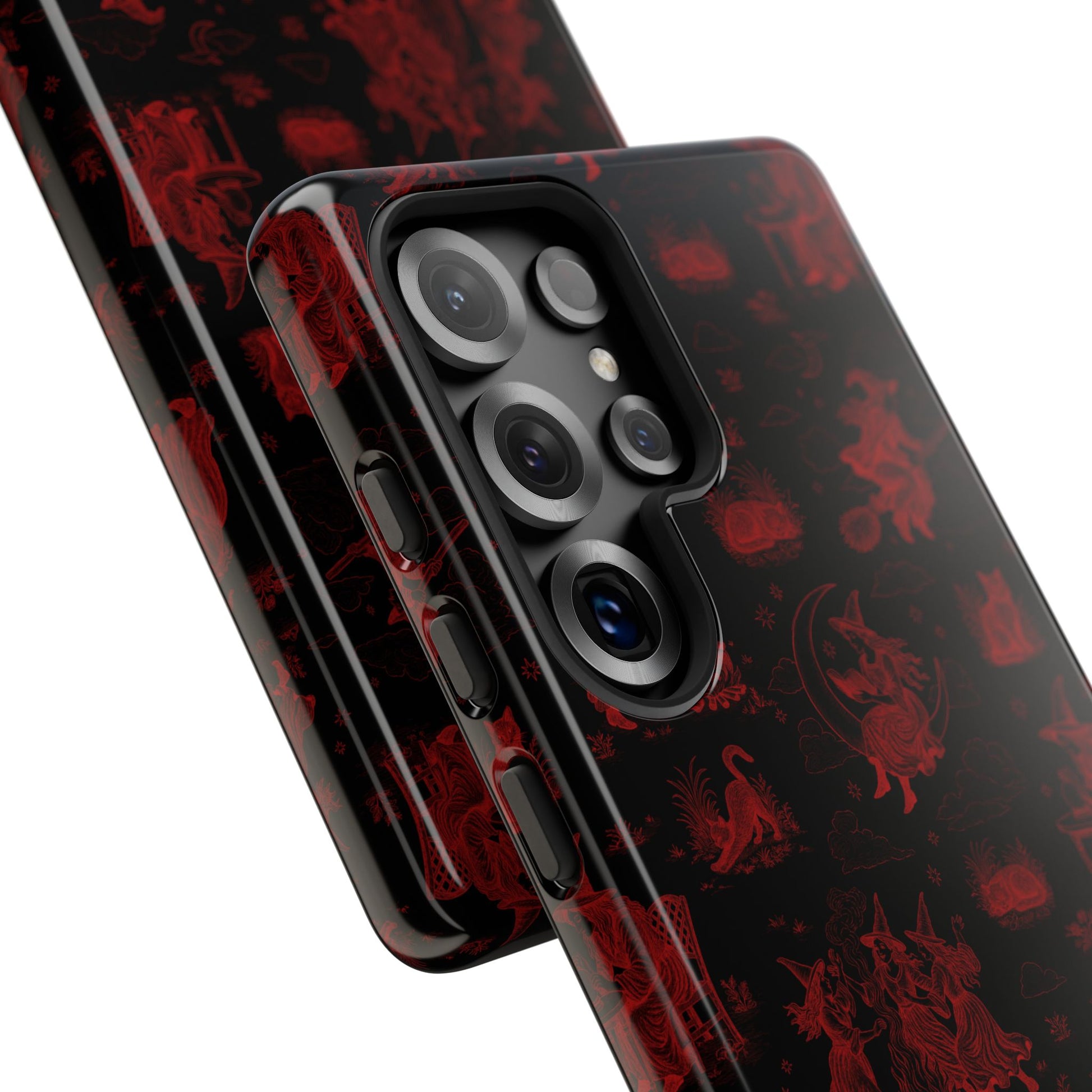 Spooky swag out your iPhone, Samsung Galaxy, and Google Pixel devices with premium-quality protective phone cases. These are printed with the Witchy Toile pattern in black/red. Every case has double layers for extra durability and protection while the clear, open ports stay out of your way when it comes to charging. The outer polycarbonate shell will resist daily impacts. Choose between matte or glossy finish and enjoy adding a unique touch to your phone with our custom protective phone cases sourced from Korea.