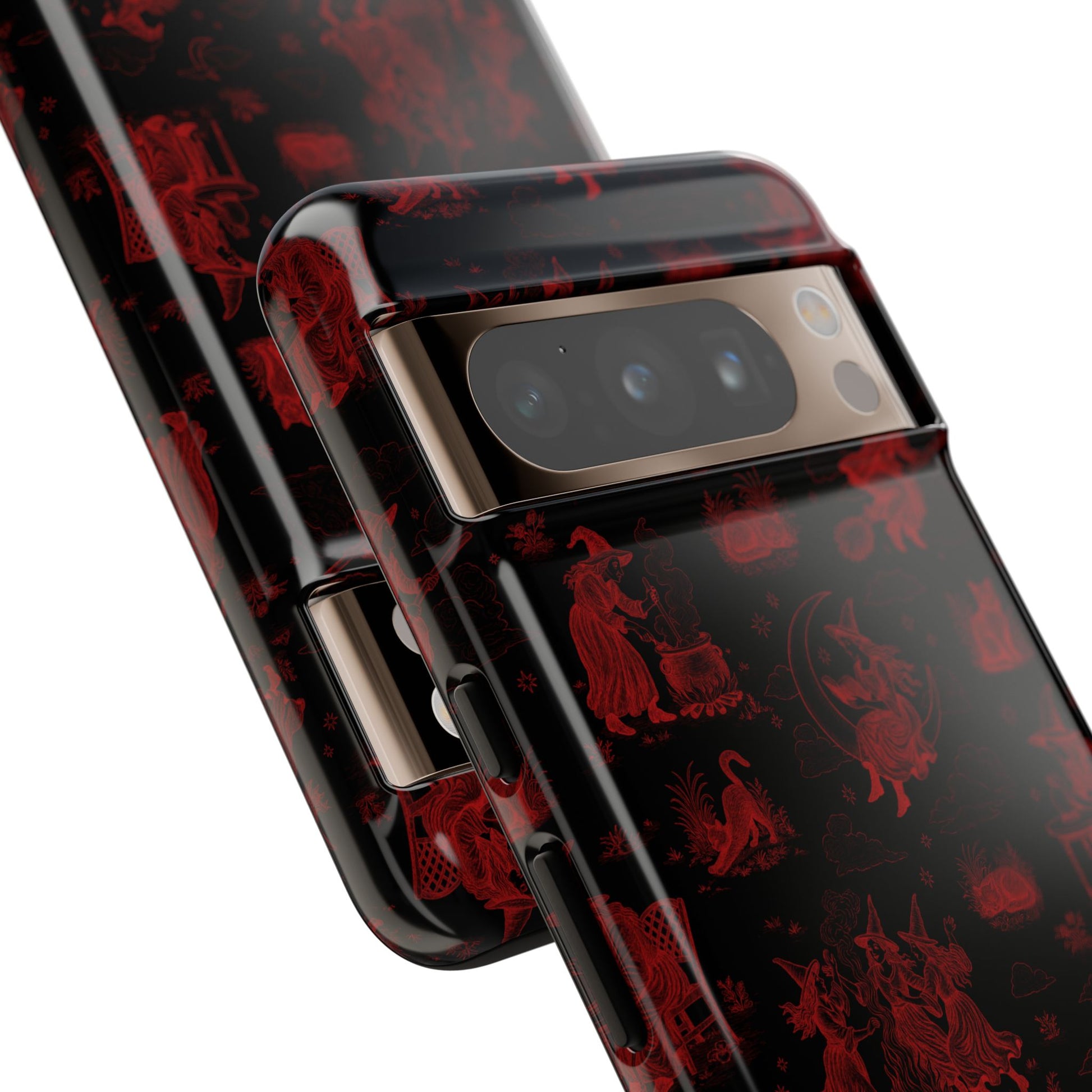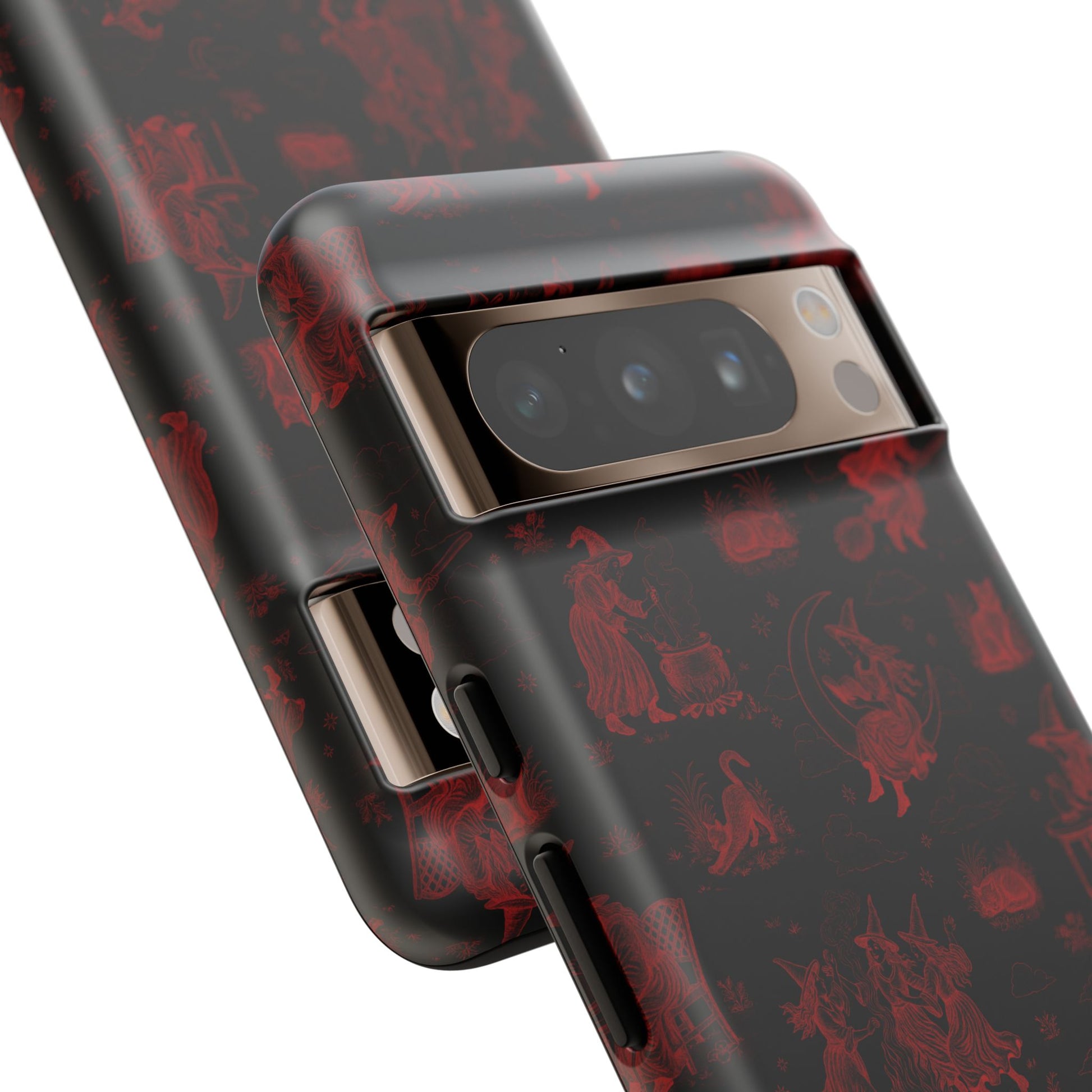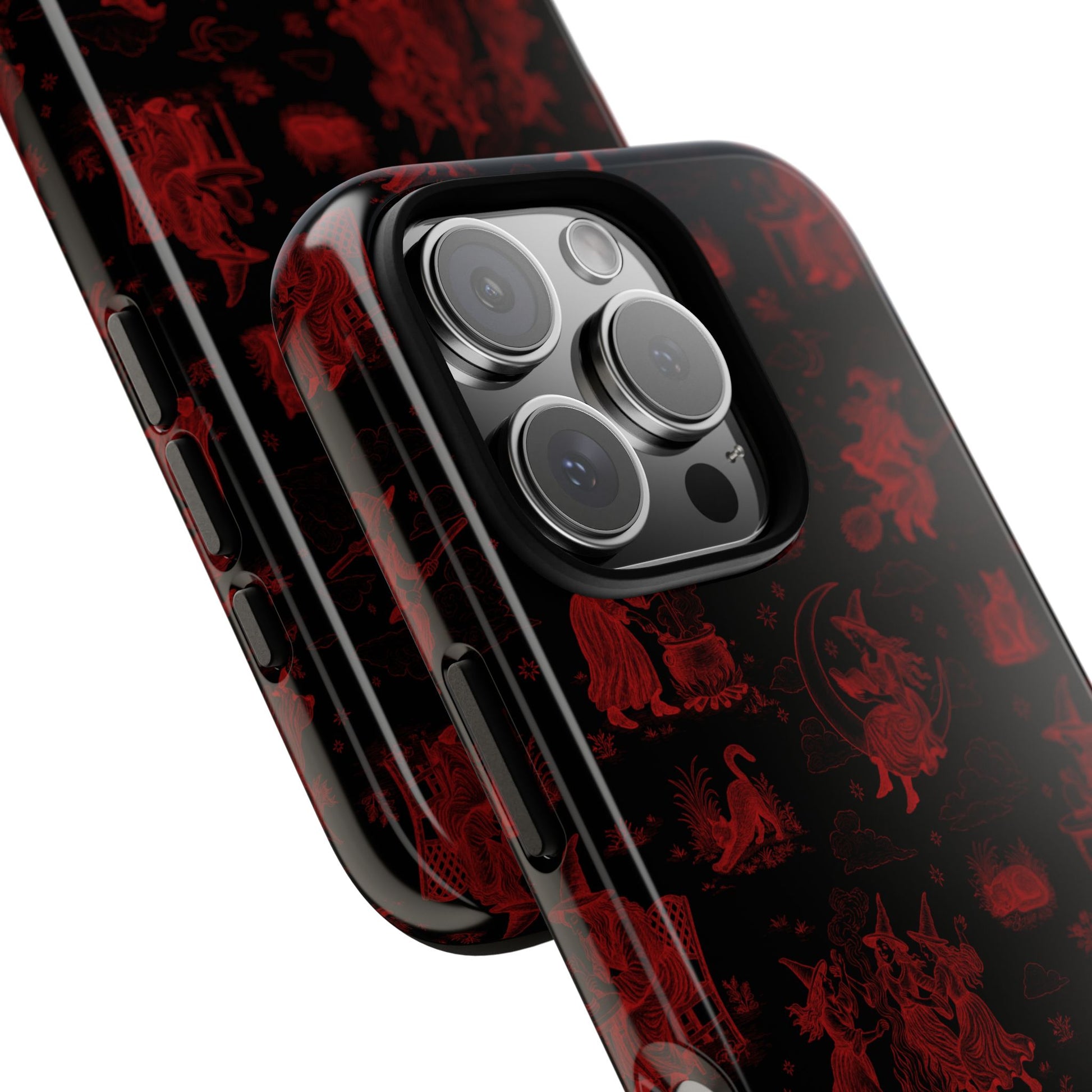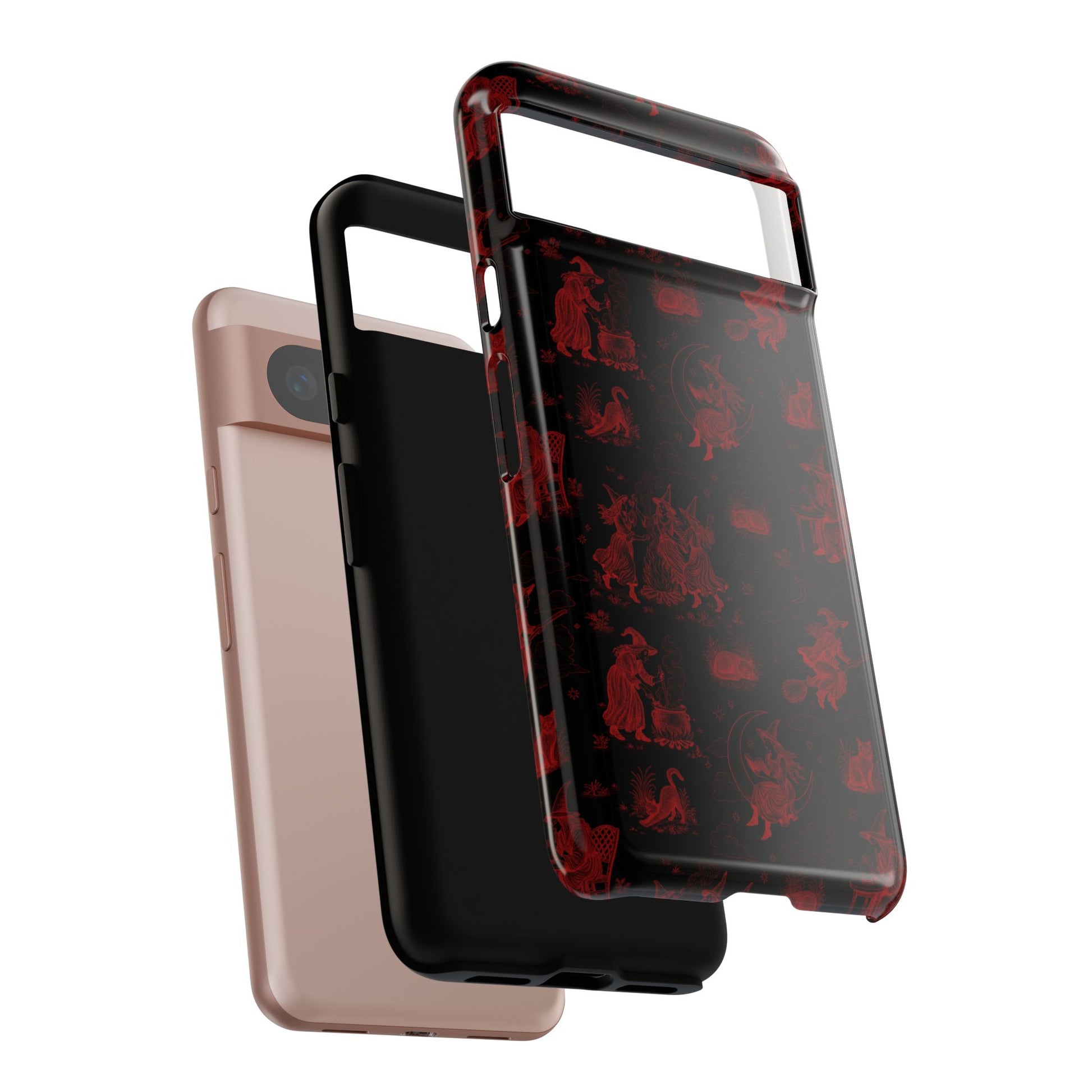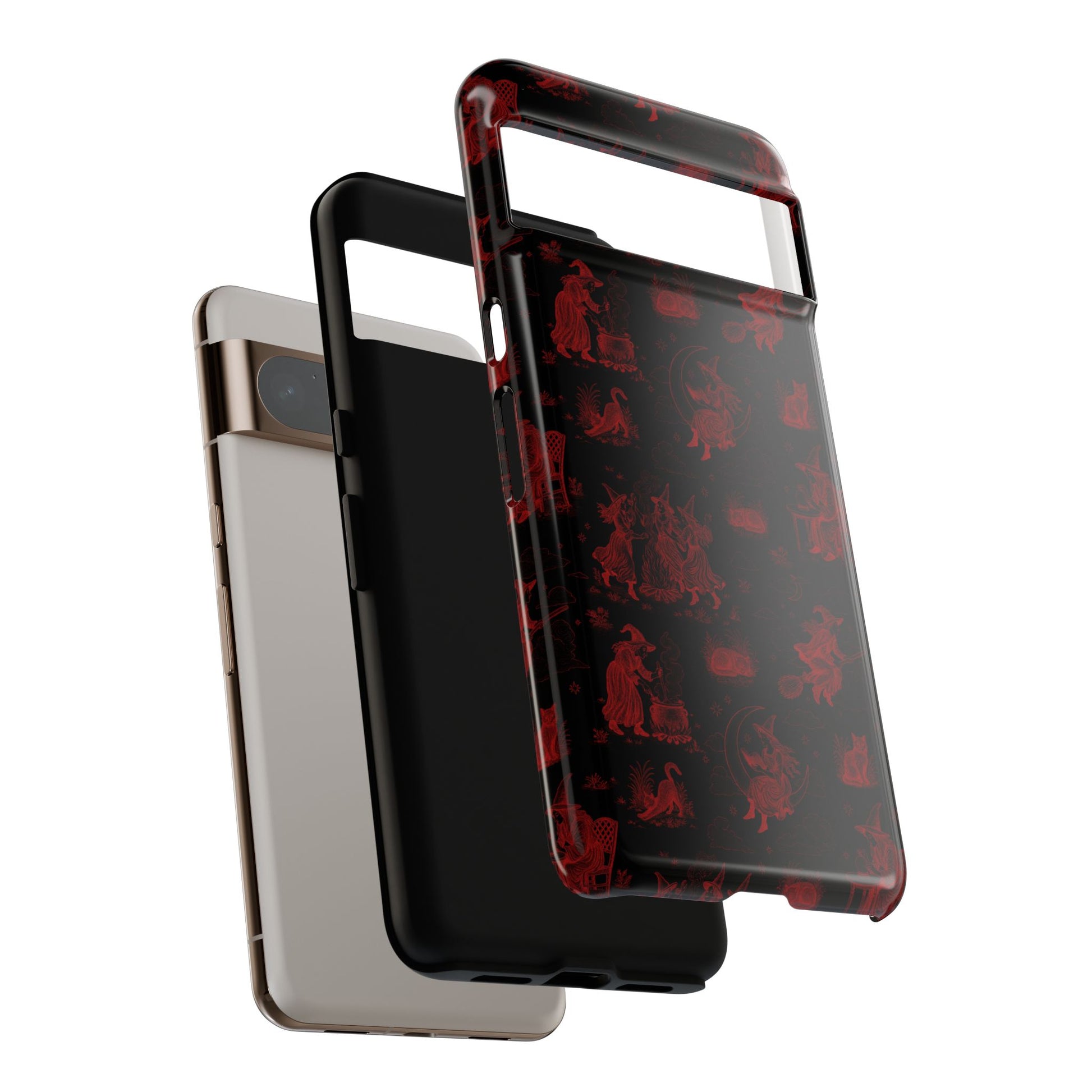 Spooky swag out your iPhone, Samsung Galaxy, and Google Pixel devices with premium-quality protective phone cases. These are printed with the Witchy Toile pattern in black/red. Every case has double layers for extra durability and protection while the clear, open ports stay out of your way when it comes to charging. The outer polycarbonate shell will resist daily impacts. Choose between matte or glossy finish and enjoy adding a unique touch to your phone with our custom protective phone cases sourced from Korea.