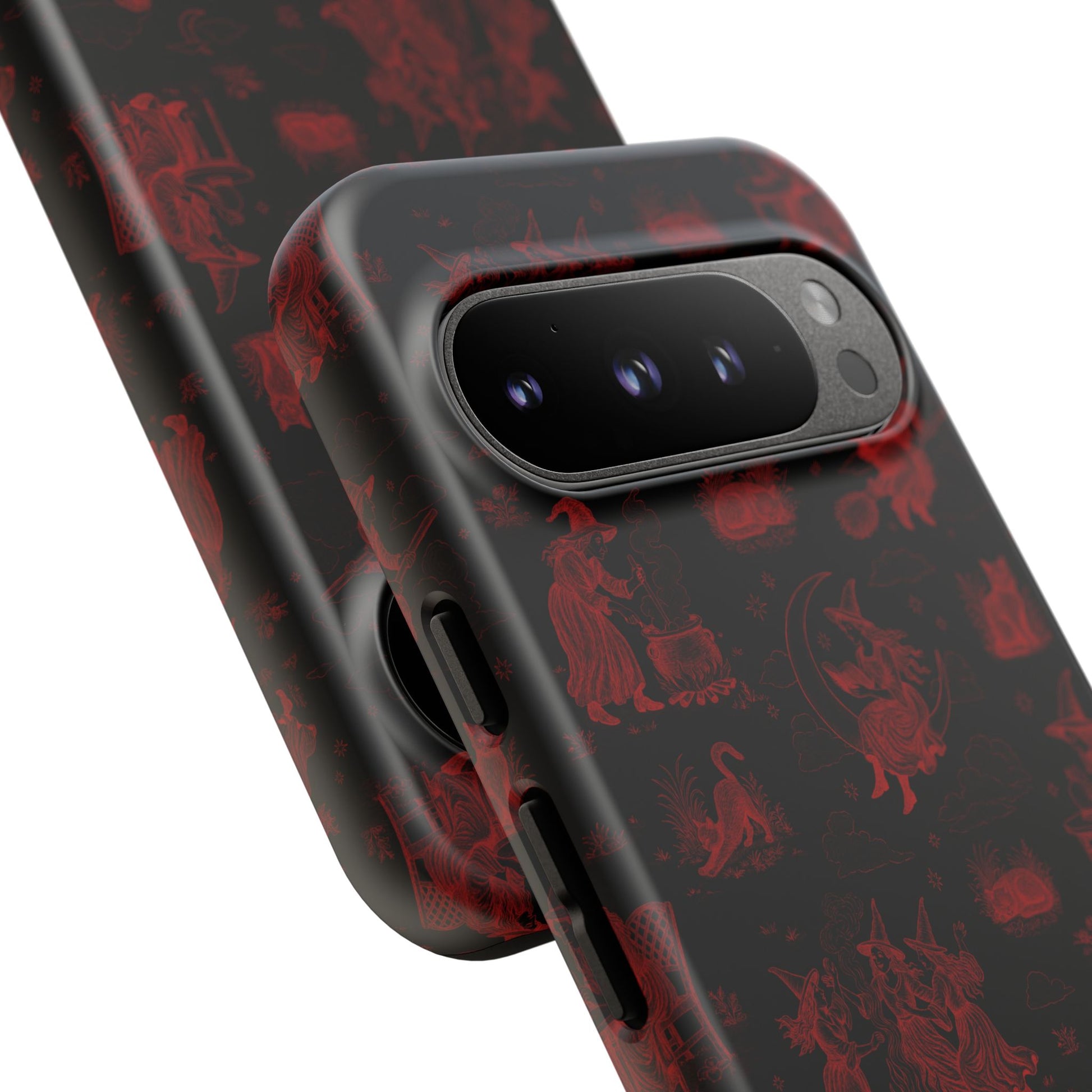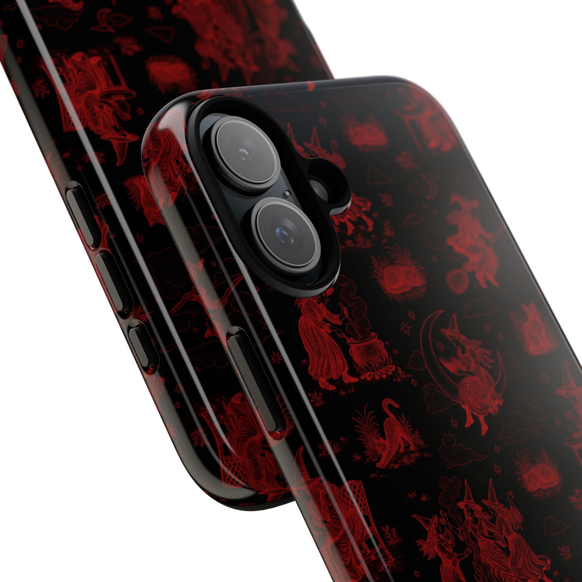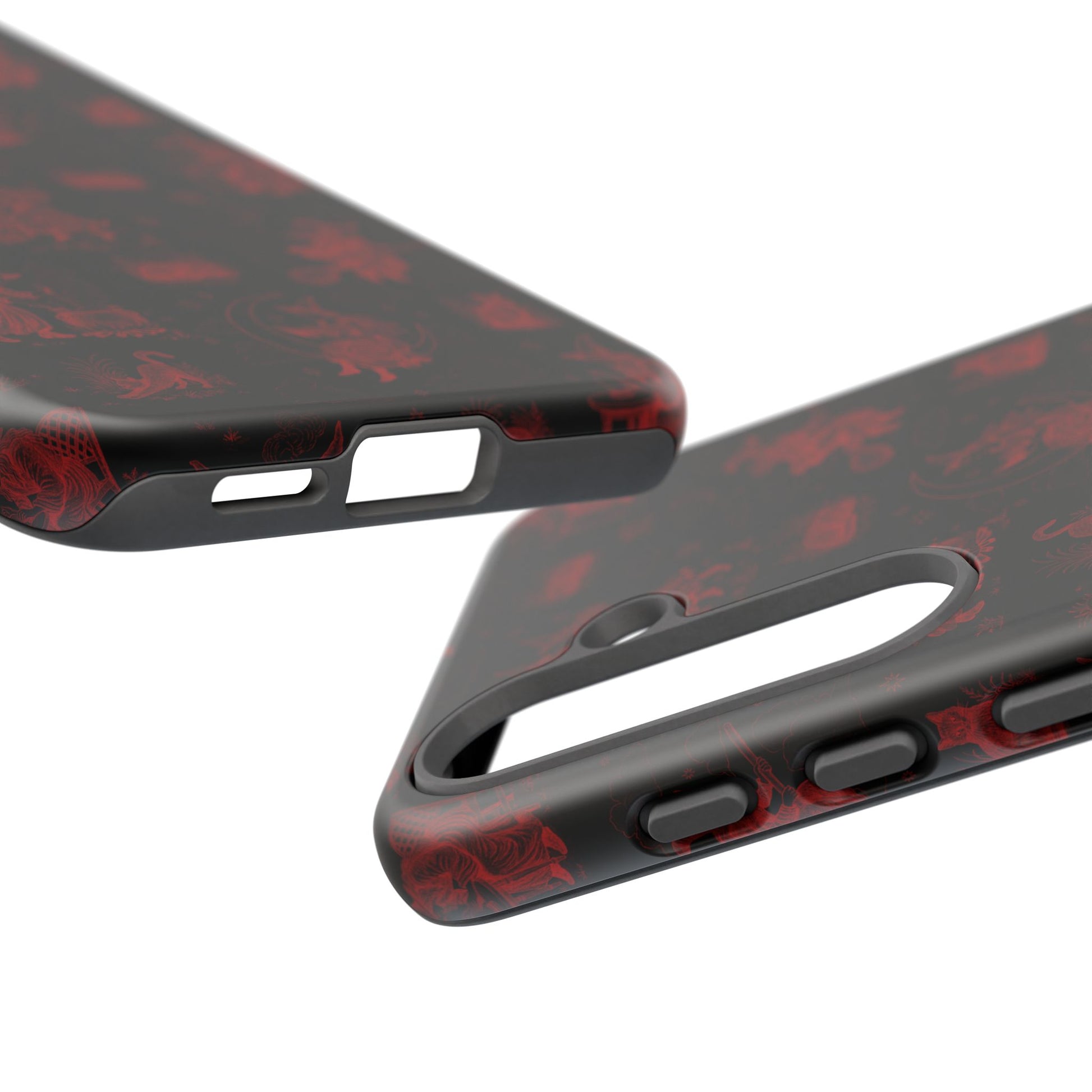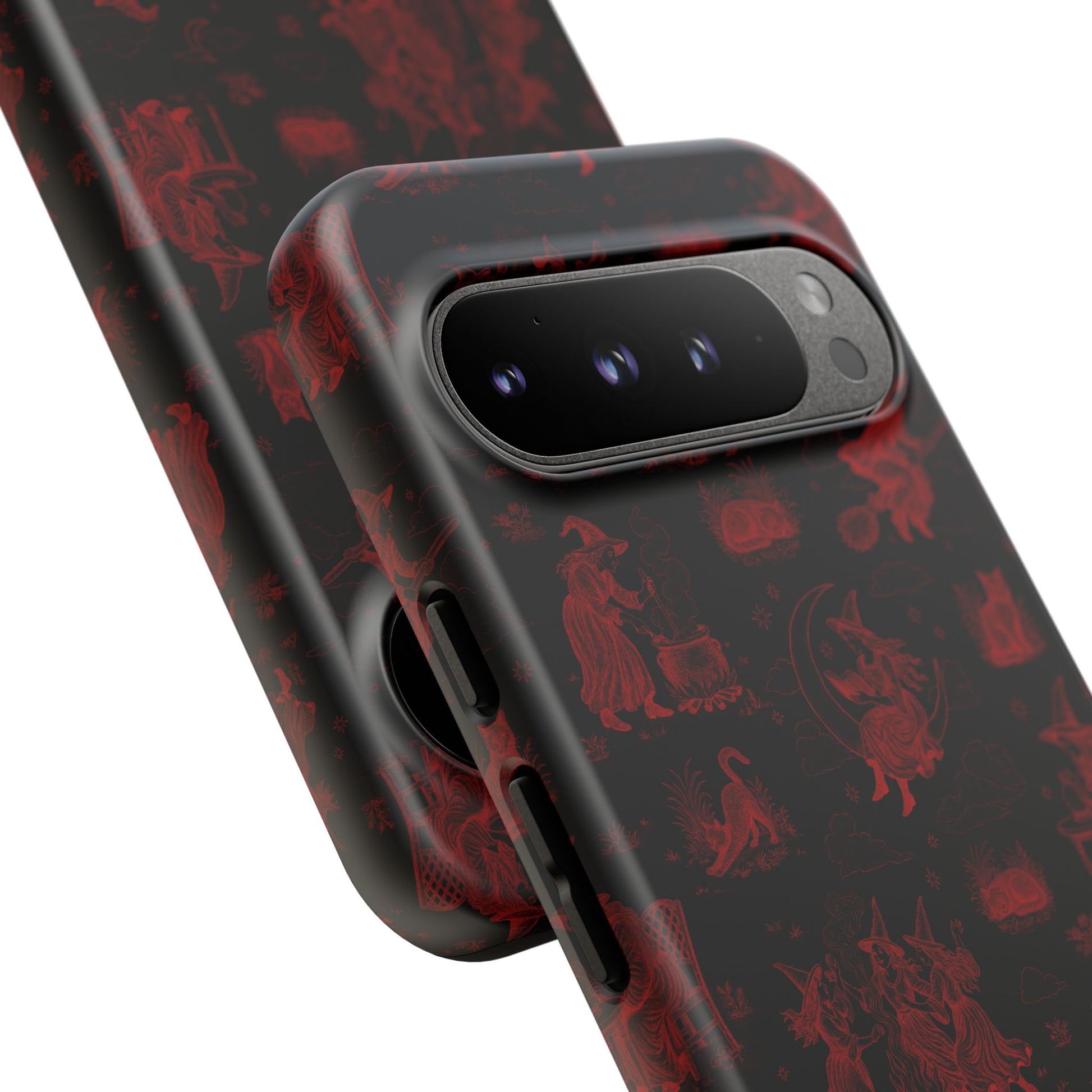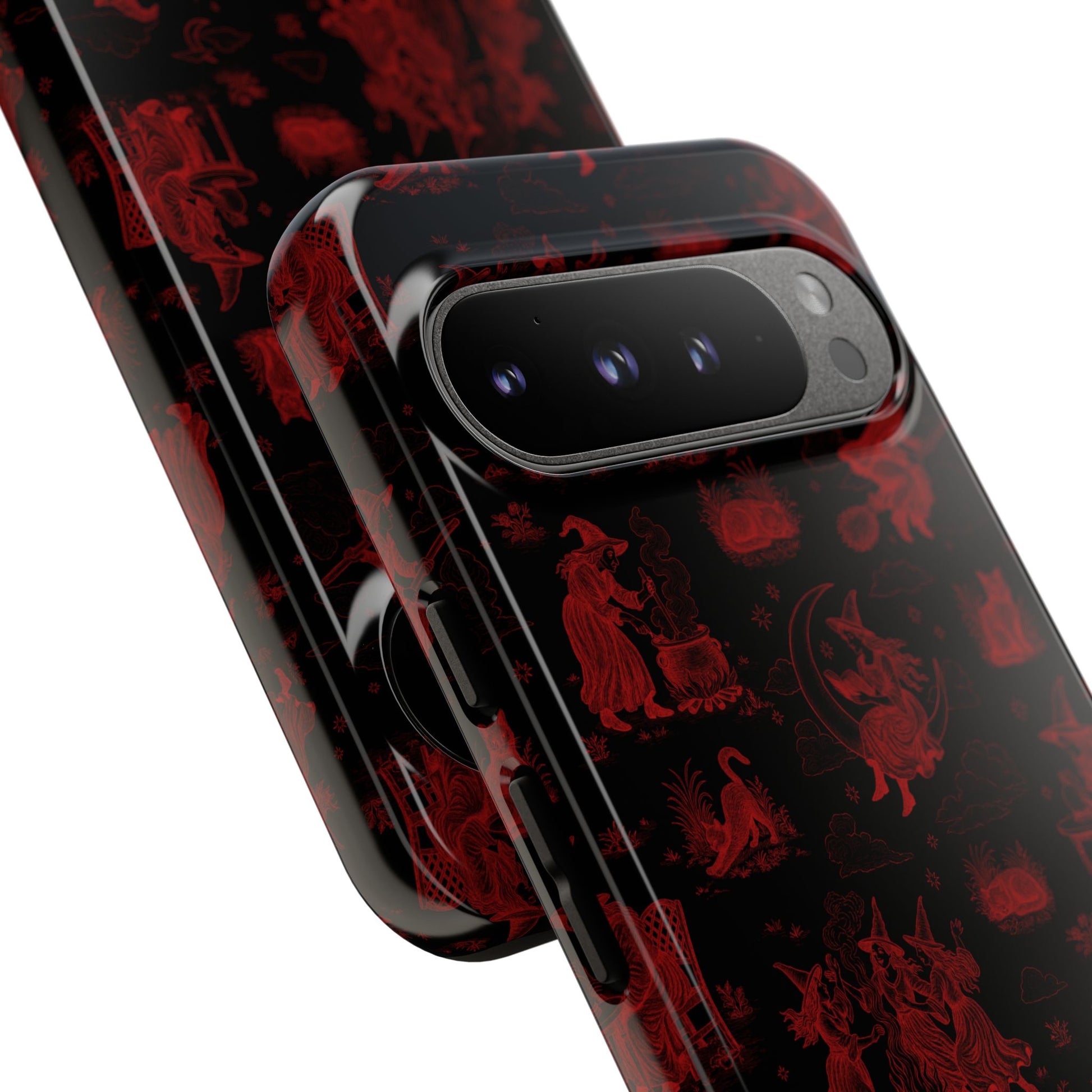Spooky swag out your iPhone, Samsung Galaxy, and Google Pixel devices with premium-quality protective phone cases. These are printed with the Witchy Toile pattern in black/red. Every case has double layers for extra durability and protection while the clear, open ports stay out of your way when it comes to charging. The outer polycarbonate shell will resist daily impacts. Choose between matte or glossy finish and enjoy adding a unique touch to your phone with our custom protective phone cases sourced from Korea.
