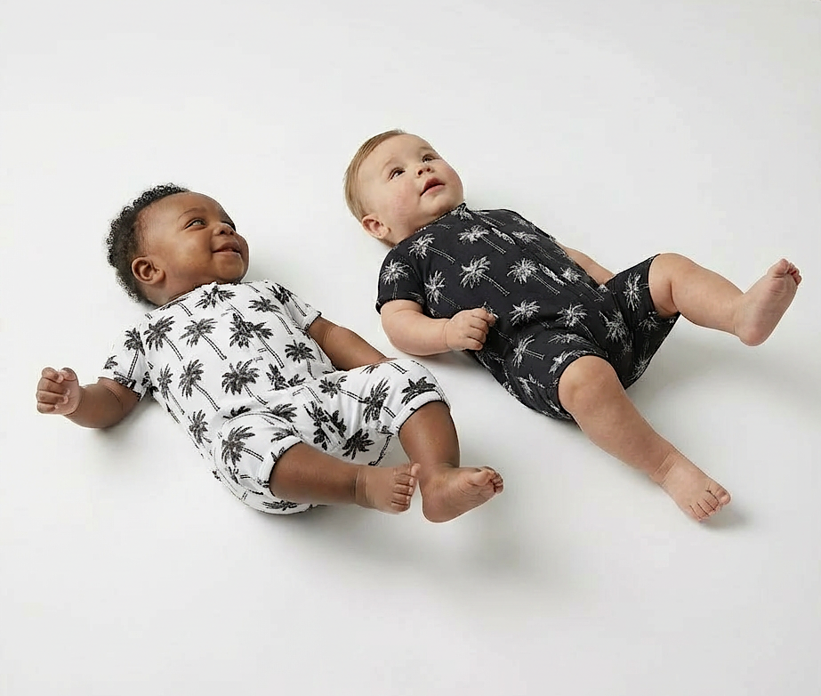 Bring the island breeze to your little one’s wardrobe with our Bamboo Shorty Romper | Palm Style Black.