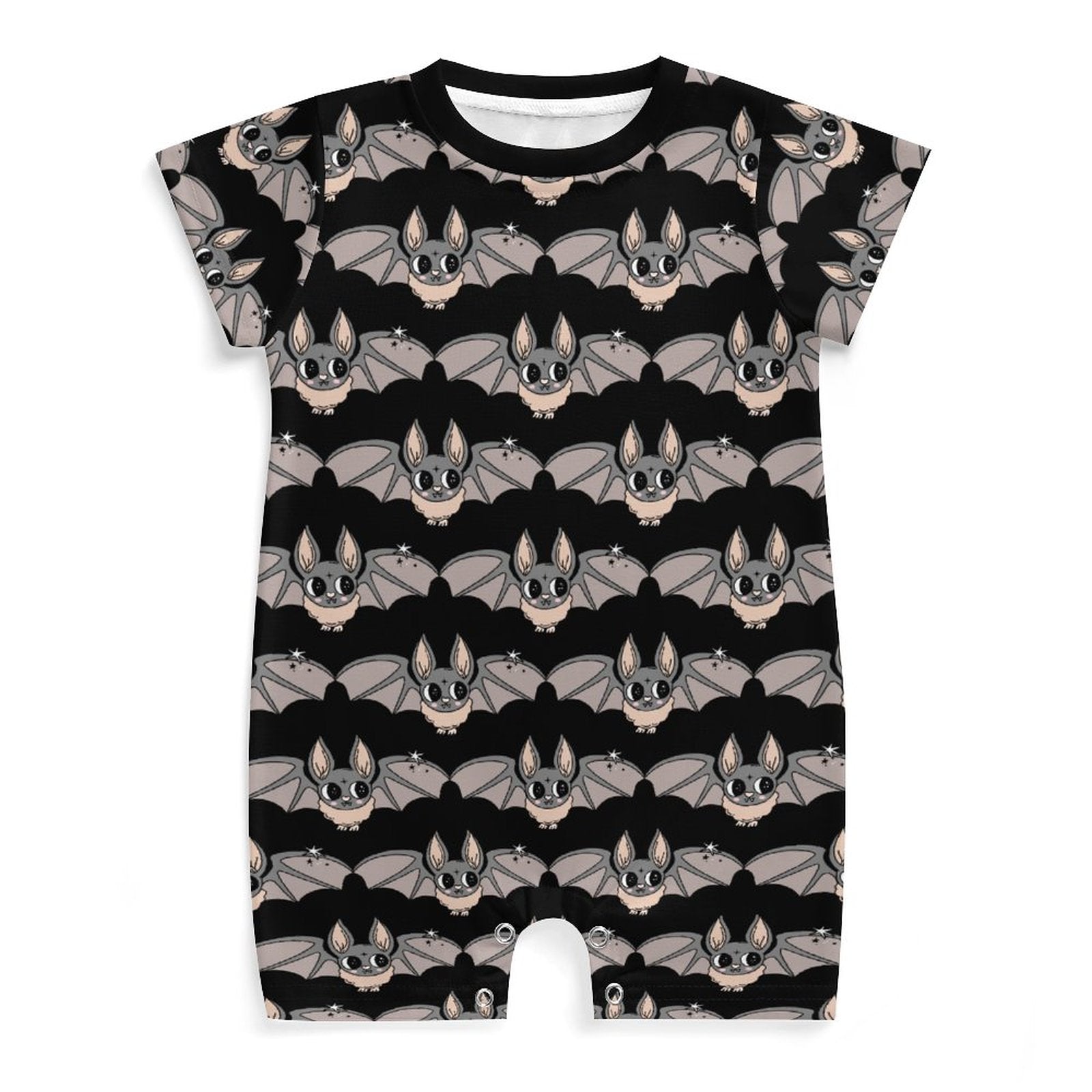 This silhouette is the perfect spring/summer style for active babies...comfy, more covering than a onesie, and oh so adorable. This one features our adorable Cheeky Bat cartoon print all over with a contrasting black collar. These baby rompers are made to order, so please allow up to a month for delivery. If you order additional items, they will be shipped separately.