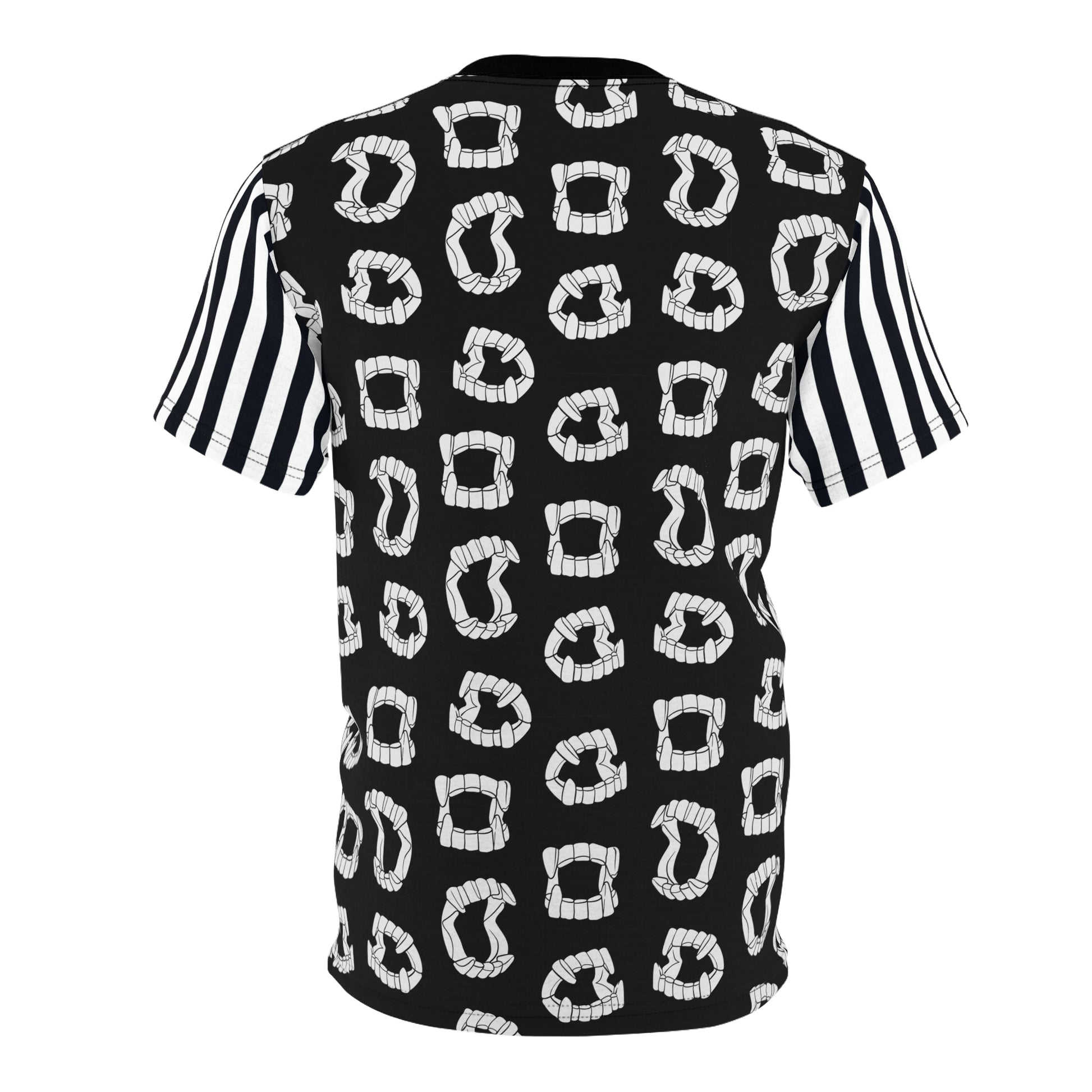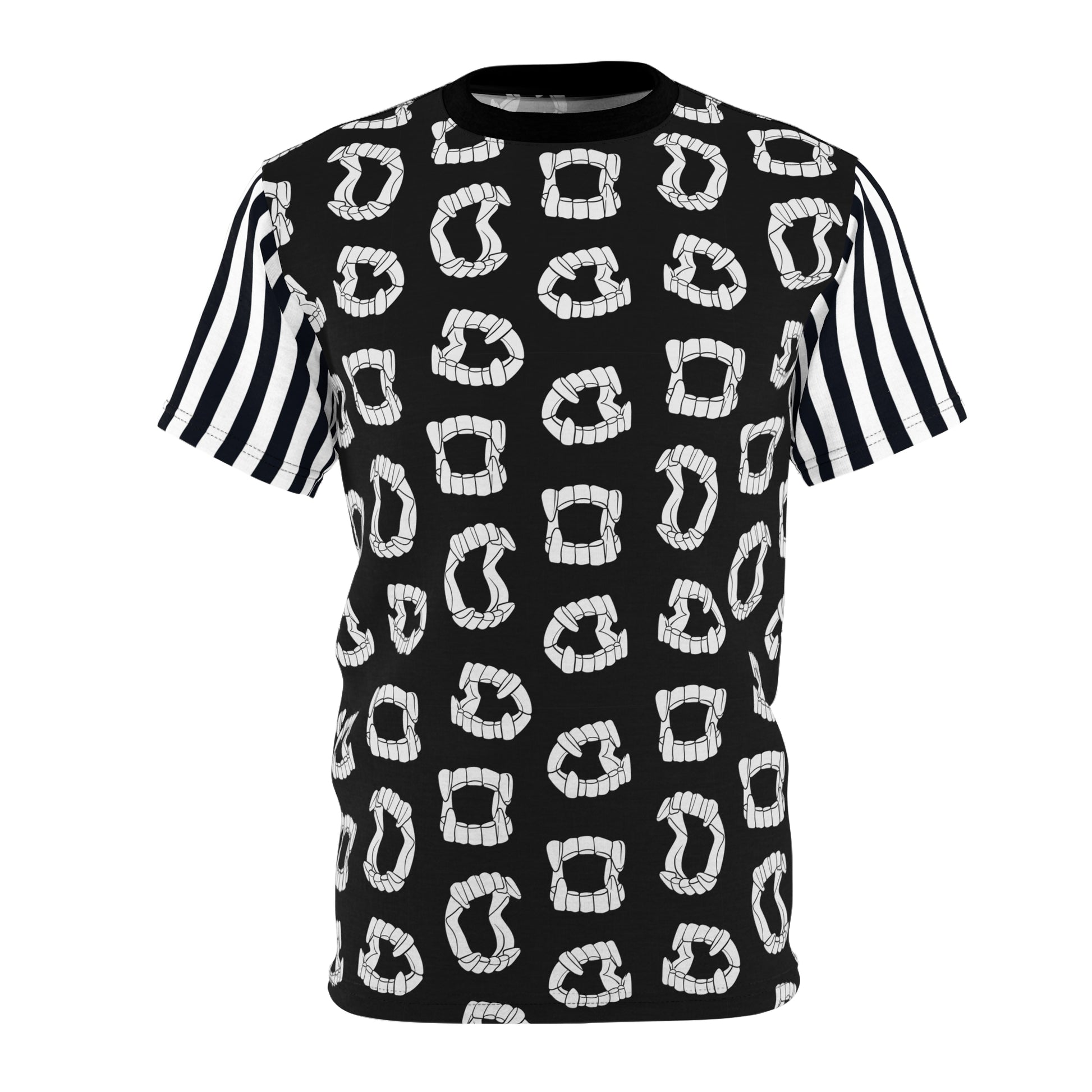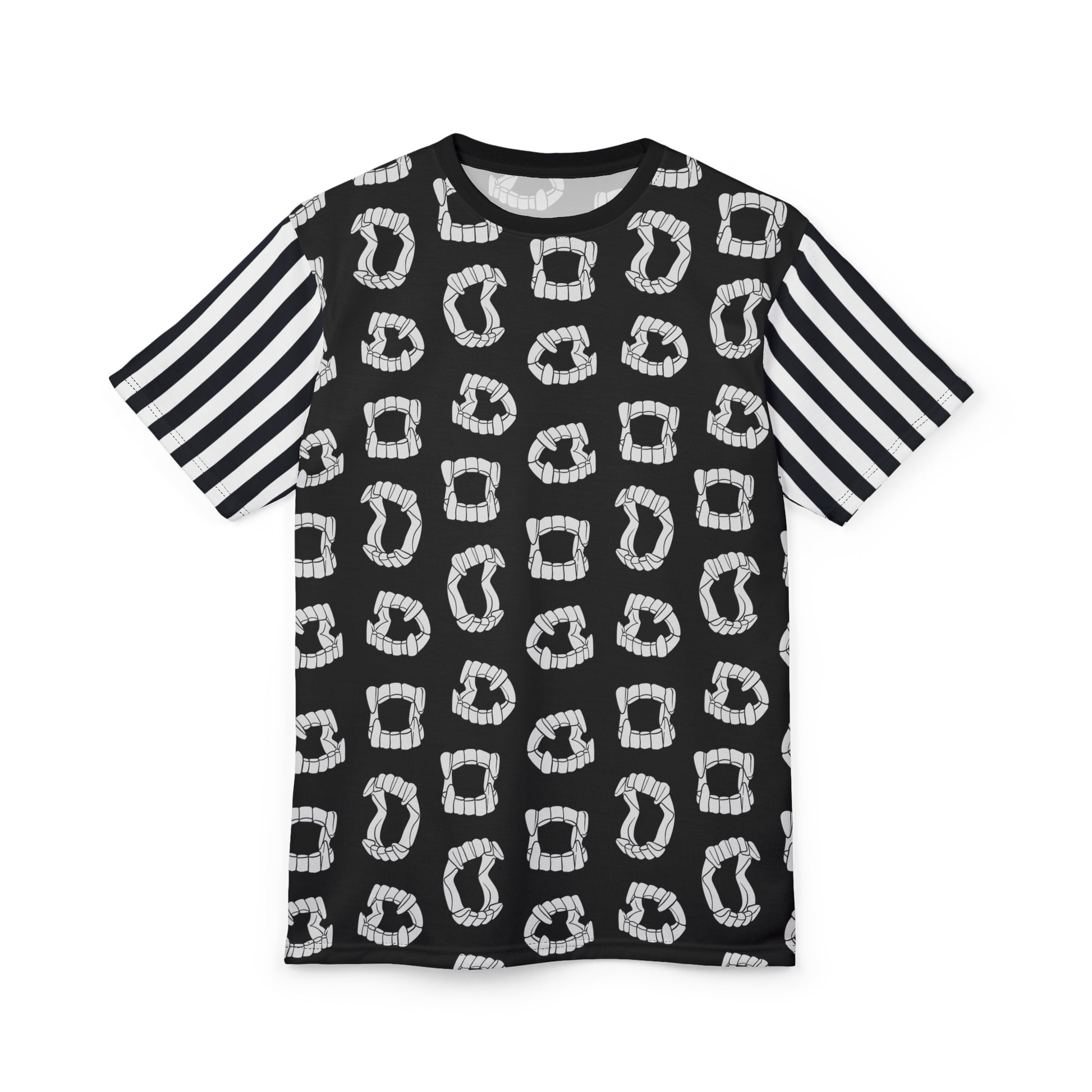This fun and spooky tee features a mix of ooky kooky prints! The body of the top features a black/white print of vampire teeth toys and the sleeves are a classic black/white stripe. This tee was created to be a versatile and stylish companion for all your creepy outings. With its uniquely textured, thick, microfiber-knit fabric, this t-shirt bears a premium, soft feel that remains lightweight and highly breathable – the perfect combo for a hot day or layering.